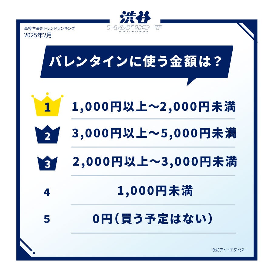 「1,000円以上〜2,000円未満」が最も多く1位にランクインしました。0円〜3,000円未満が全体の73.9%を占めており、なるべく予算を抑えながらバレンタインデーを楽しむ高校生が多い結果となりました。