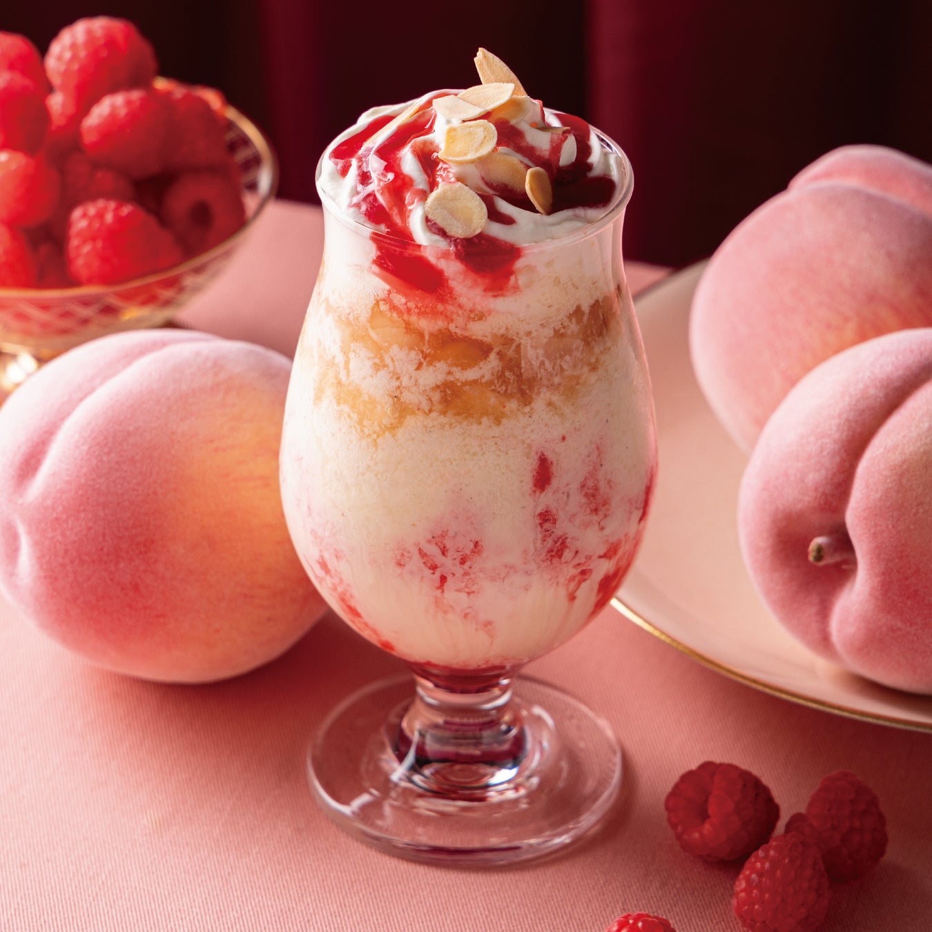 アールグレイでコンポートした桃の果肉をたっぷりと加え、フローズン部分は、香り高いバニラビーンズを使用したバニラカスタードと、香ばしい風味を持つアマレットシロップ、甘酸っぱいアプリコットシロップを合わせた風味豊かな味わいに。トッピングにはラズベリーソースとアーモンドを使用し、フランス発祥の伝統的な桃のスイーツ“ペッシュメルバ”を思わせるようなデザートドリンクをお楽しみいただけます。
