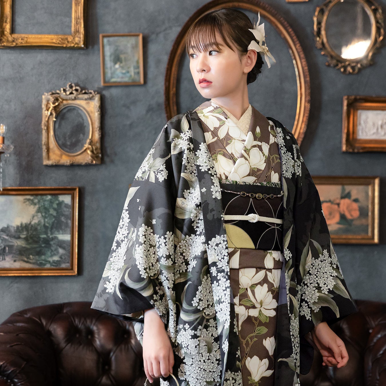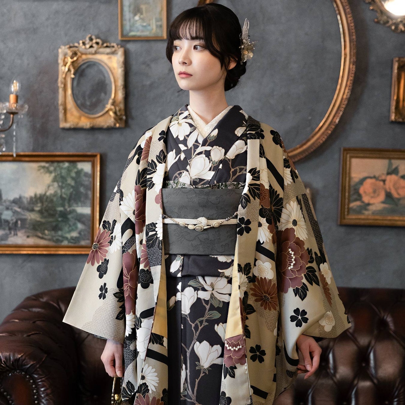浅いグレージュの地に、黒のエ霞、濃いベージュグレーの鹿の子の雲、その上に牡丹を中心とした梅、菊、桜などのさまざまな花紋。鴇浅葱、白、ベージュなどの落ち着いた色を黒で引き締めた配色が和モダンな印象です。裏地はベージュ。