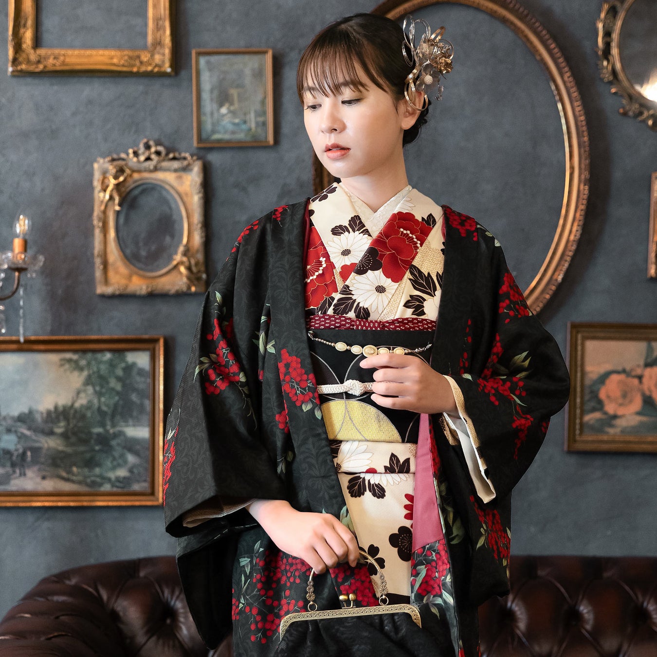 黒地に濃いグレーのアラベスク文様、その上に赤い南天が表現されています。深い赤色の実に灰黄緑の枝葉、チャコールのぼかしが立体感を演出。ダークな中に華やかさのあるデザインです。裏地は深い赤色。