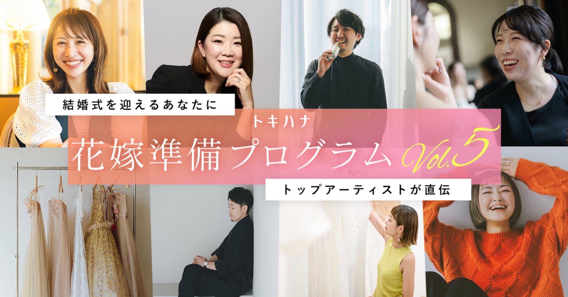 LINEでできる式場探し『トキハナ(https://tokihana.net/)』を運営する株式会社トキハナ(本社:東京都港区、代表取締役社長:安藤 正樹、以下 「トキハナ」)は、ウエディングの各界を代表するトップアーティスト7名とコラボレーションし、花嫁の結婚式準備をサポートする「花嫁準備プログラムvol.5」を開催します。