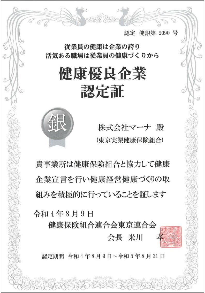 生活雑貨メーカー株式会社マーナ(東京都墨田区、代表取締役 名児耶 美樹[なごや よしき])は、東京実業健康保険組合に「健康企業宣言」を行い、健康保険組合連合会東京連合会に健康経営に向けた取り組みが評価され、健康優良企業「銀の認定」を取得いたしました。(健康優良企業認定番号 健銀第2090号)