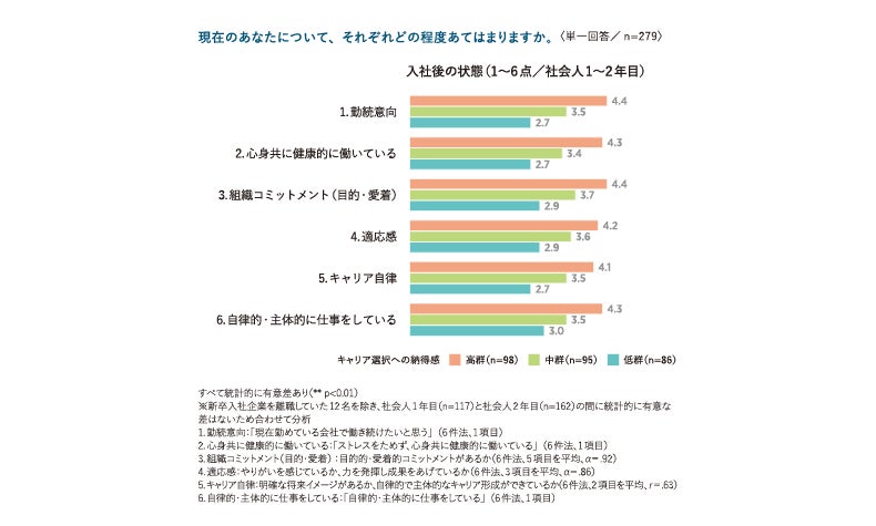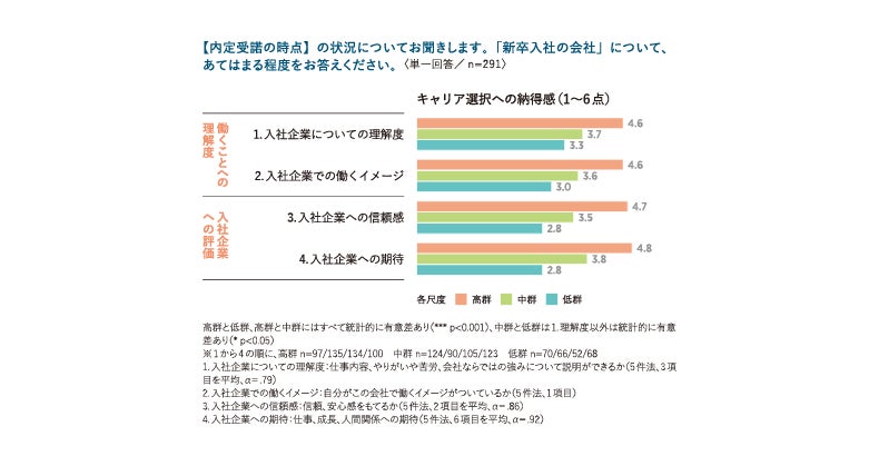 ・キャリア選択への納得感の高・中・低群で納得感に差があるかを調べ、その後多重比較を行ったところ、すべてのグループ間において統計的に有意に差があることが確認でき、内定受諾時点のキャリア選択意識が入社後の状態に影響することが示された。