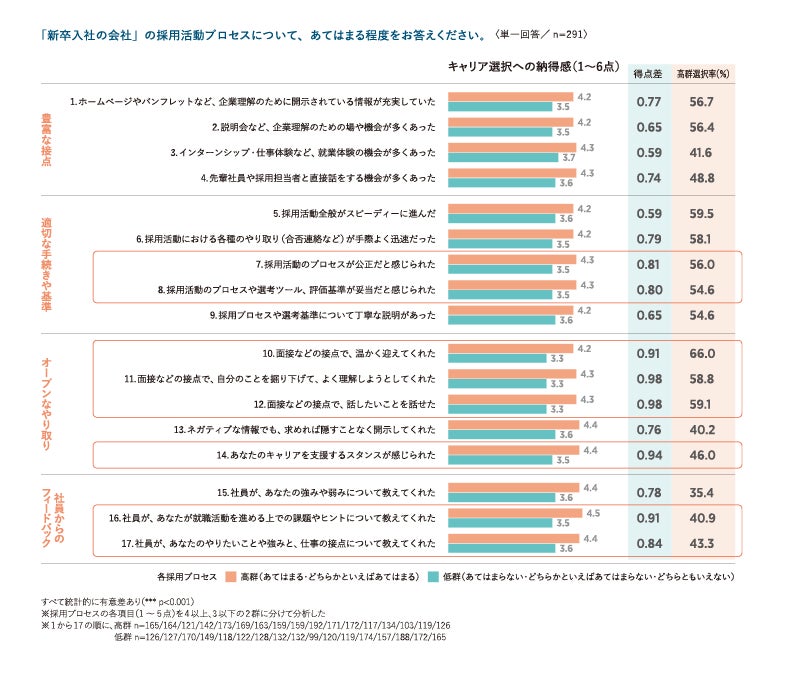 ・新卒入社した企業の採用プロセスの特徴に関する17項目それぞれについて、あてはまる程度の高い高群とそうでない低群別にキャリア選択への納得感の差を比較した。その結果、「豊富な接点」「適切な手続きや基準」「オープンなやり取り」「社員からのフィードバック」のすべてのカテゴリ・17項目について、高群が低群よりも高かった。