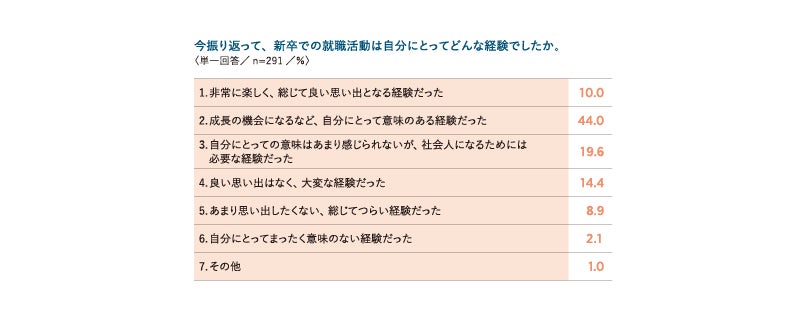 ⇒比較的ポジティブに受け止めている人が多い一方、少なからずネガティブな経験だったと捉えている人がいることには留意したい。新卒の採用活動の仕組みは若年層の失業率を下げるなどよい側面がある一方、学生本人の負担は大きい。企業・学生双方に必要な仕組みだからこそ、よりよい就職活動・採用活動のためにそれぞれの立場で何ができるのか、考えていく必要があるだろう。
