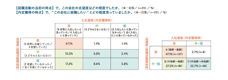 ・新卒で入社した企業について、就職活動を始めた当初の志望度と、内定獲得時の入社意欲をそれぞれ振り返ってもらい、5段階評価で回答を求めた。志望度と入社意欲を高(5・4点)、中(3点)、低(2・1点)に分け、その組み合わせを集計した。