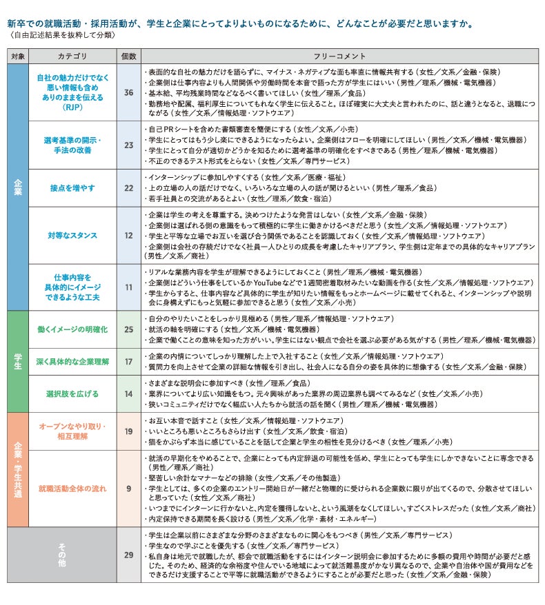 ・新卒での就職活動・採用活動が、学生と企業にとってよりよいものになるために、どんなことが必要だと思うかを尋ねたコメントを抜粋すると、「自社の魅力だけでなく悪い情報も含めてありのままを伝える(RJP:Realistic Job Preview)」や、企業側が学生との「対等なスタンス」をもつことを求める声が挙がった。