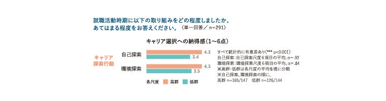 ・「自己探索」は自分のことを客観的に理解することで、就職活動の自己分析にあたり、「環境探索」は働くことや職業や業界についての理解を深めるための情報収集や対話・体験をするインターンシップや仕事分析・業界研究にあたるが、自己探索、環境探索共に高群の方が、キャリア選択への納得感が高かった。