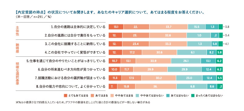 ・内定受諾時点のキャリア選択への納得感の状態について確認するために、主体的に決定できているか、選択について納得しているか、明確な選択基準があったかという観点で評価してもらったところ、「とてもあてはまる」「あてはまる」を選んでいるのは21~35%、「ややあてはまる」まで合わせると、5~6割が肯定的な回答だった。