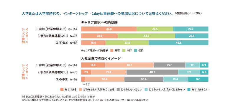 ・就業体験の有無が入社企業で働くイメージのしやすさとも関係し、最終的なキャリア選択への納得感の高・中・低にも関係している。