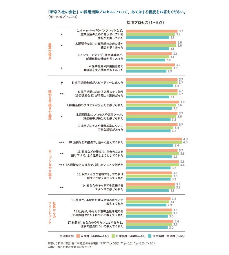 ・志望度と入社意欲の変化のA~Cの3群ごとに、「新卒入社の会社」の採用プロセスに関する17項目に対して影響が見られるか確認したところ、A群とB群とで、各項目の平均値に統計的に有意な差は見られなかった。