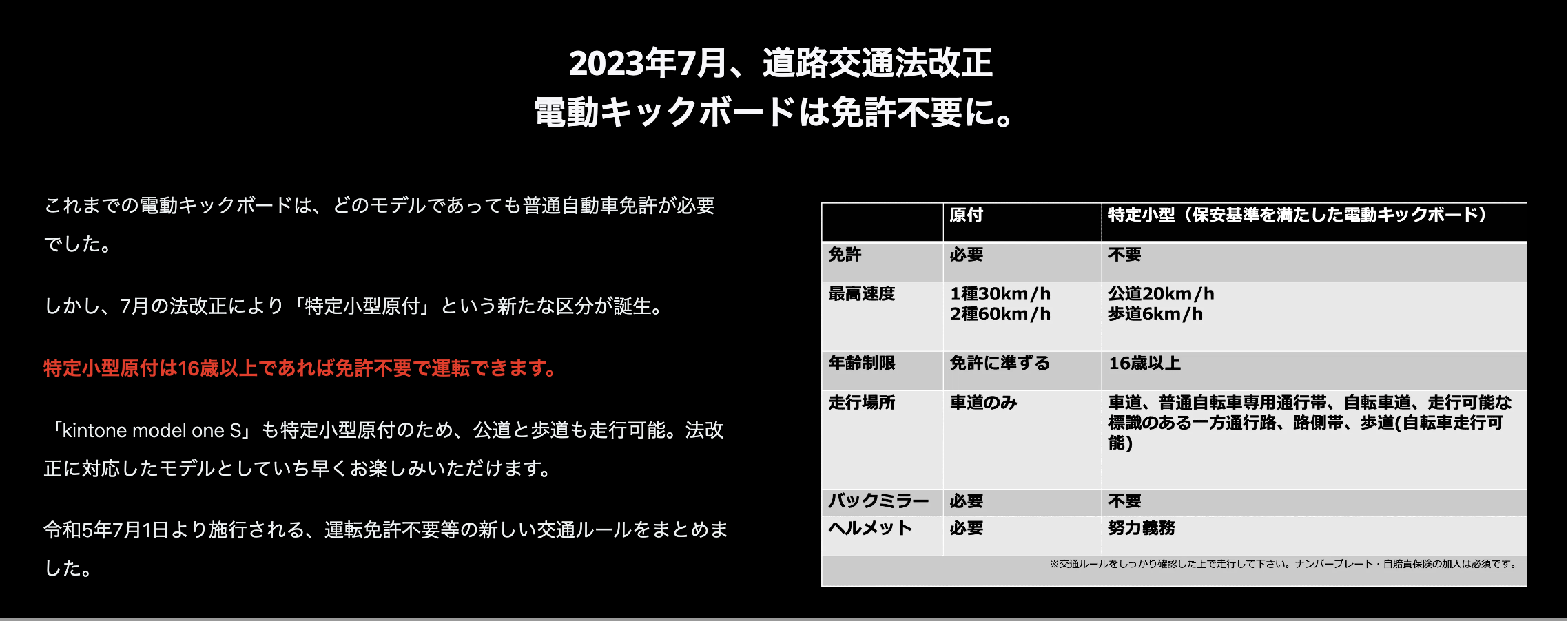 今回の改正道路交通法の施行に合わせ、以前から開発を進めていた新しい法律に適合する「Kintone model one S」の発売を決定しました。現行モデルのパワフルさを引き継ぎつつ、公道走行可能でより手軽に乗れるように設計しました。