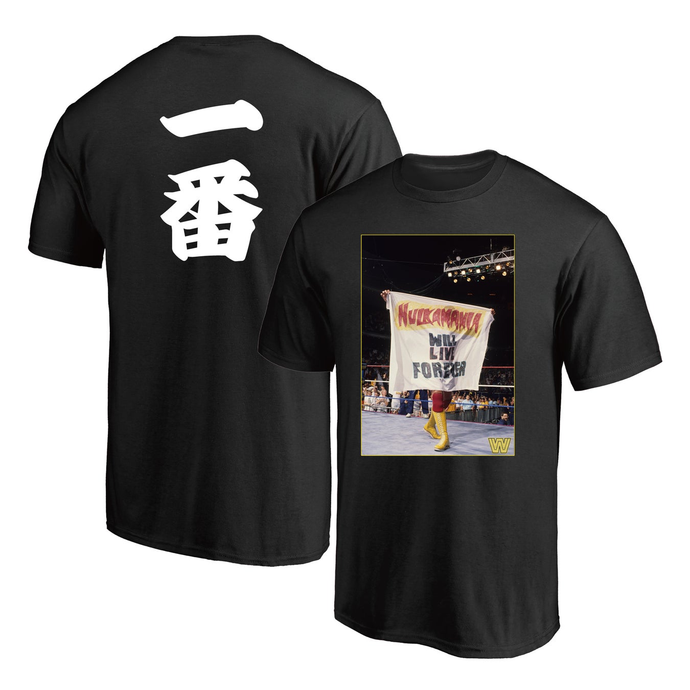 今回の記念グッズでは、アクリルスタンド、アクリルキーチェーンを中心とした日本限定商品をはじめ、WWEファンには必須アイテムとなるレスラーフォーカスのTシャツなど、小物を含めた幅広いラインナップとなっております。特にハルク・ホーガンデザインの漢字【一番】のバックプリントは非常にインパクトのある一品に仕上がっております。