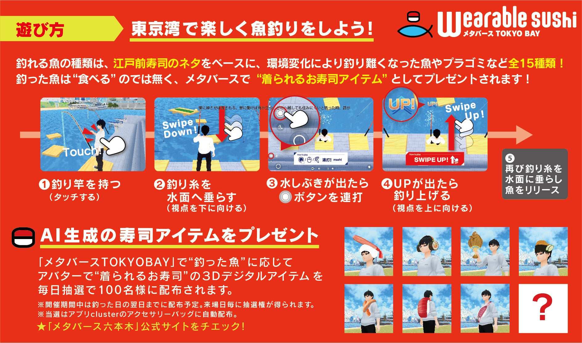 東京都が主催する「Virtual Edo-Tokyoプロジェクト」と連動して、来場者150万人を超える「光と星のメタバース六本木」などメタバース事業を展開するテレビ朝日が、東京湾で魚釣りが楽しめるメタバースワールド『メタバースTOKYOBAY〜Wearable Sushi〜』をオープンさせます。釣れる魚の種類は江戸前寿司のネタをベースに全15種類で、釣った魚は食べるのでは無く、メタバースでは“着られるお寿司アイテム”としてプレゼントされます!同エリア内では場所によって釣れる魚種も変わり、環境変化により釣り難くなった魚やプラスチックゴミ等が釣れることも!釣った魚に応じて毎日抽選で100名様に、AI生成の3D 寿司アイテムが配布されます!来場日毎に抽選権が自動付与されるので毎日来場すると獲得確率が上がるかも!!イベント期間中に全15種類をコンプリートして、是非このファショナブルなデジタルアイテムをご自分のアバターにまとって遊びに来てください!!東京都の多数あるワールドでも注目されること間違いなしです!!