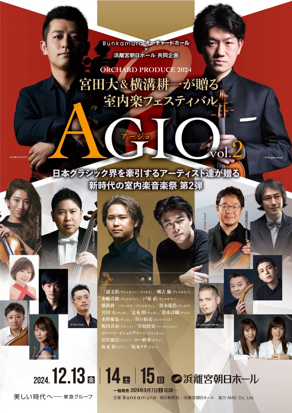 12月13日(金)~15日(日)に浜離宮朝日ホールにて、朝日新聞社・浜離宮朝日ホールとの共催企画として『宮田大&横溝耕一が贈る室内楽フェスティバル AGIO vol.2』の開催が決定しました。