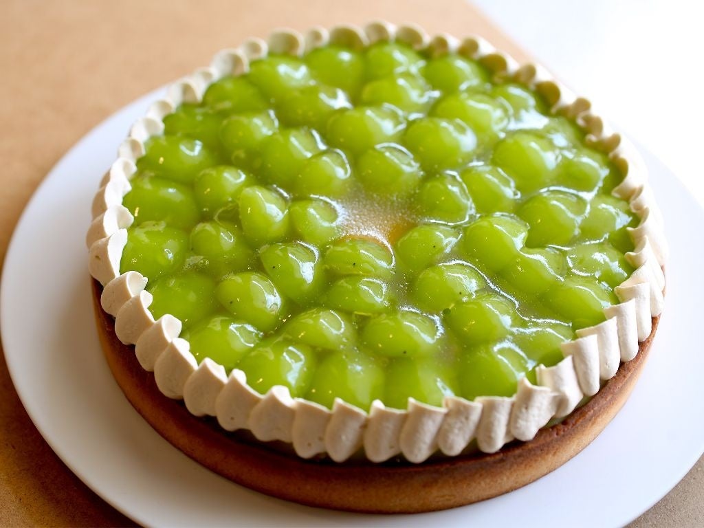 卵、乳製品、小麦粉不使用のタルトにマスカットとの相性の良い風味豊かなアーモンド生地と程よい酸味のラズベリージャムをアクセントに忍ばせ、豆乳カスタードにたっぷりのシャインマスカットを乗せてマスカットジュレでコーティングした芳醇で味わい深いヴィーガンタルトに仕立てました。