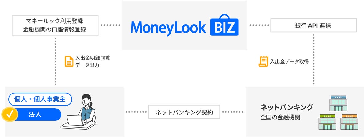 「MoneyLook BIZ」は、自社でのご利用を目的とした銀行入出金明細自動取得サービスです。複数ある銀行口座の入出金明細情報やクレジットカードの利用明細・引落情報などをAPI連携で自動取得して一元管理でき、また取得したデータは「財務会計」「販売管理」「入金消込」「与信管理」などの業務システムにAPI連携やCSV出力で取り込みも可能なため、その後の入金消込や仕訳連携など煩雑な経理作業を軽減することができます。「MoneyLook BIZ」は、金融機関の明細情報と紐づくバックオフィスの管理業務を大幅に効率化できるサービスです。