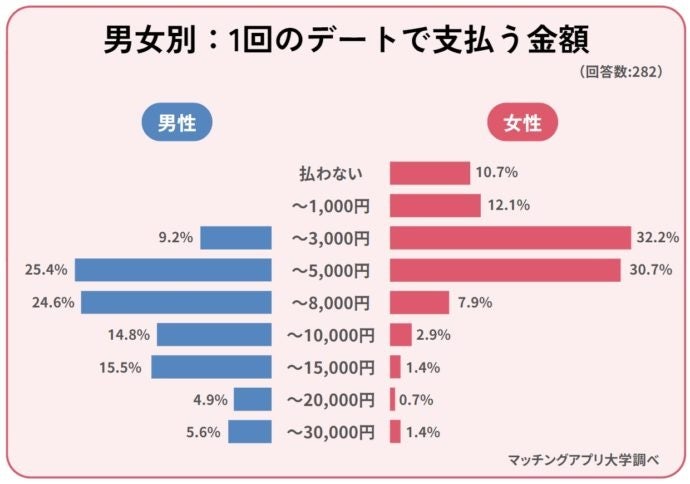 男性の支払いは女性の約2.5倍!さらに女性の10.7%は、デート代は「出さない」と回答