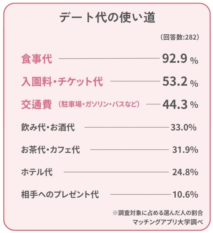 今回、株式会社ネクストレベル(本社所在地:神奈川県横浜市、代表取締役:田中大洋)が運営するマッチングアプリ大学(https://jsbs2012.jp/)では、現在恋人がいる、もしくは1年以内に恋人がいた男女282人にデート代についてアンケート調査を実施しました。