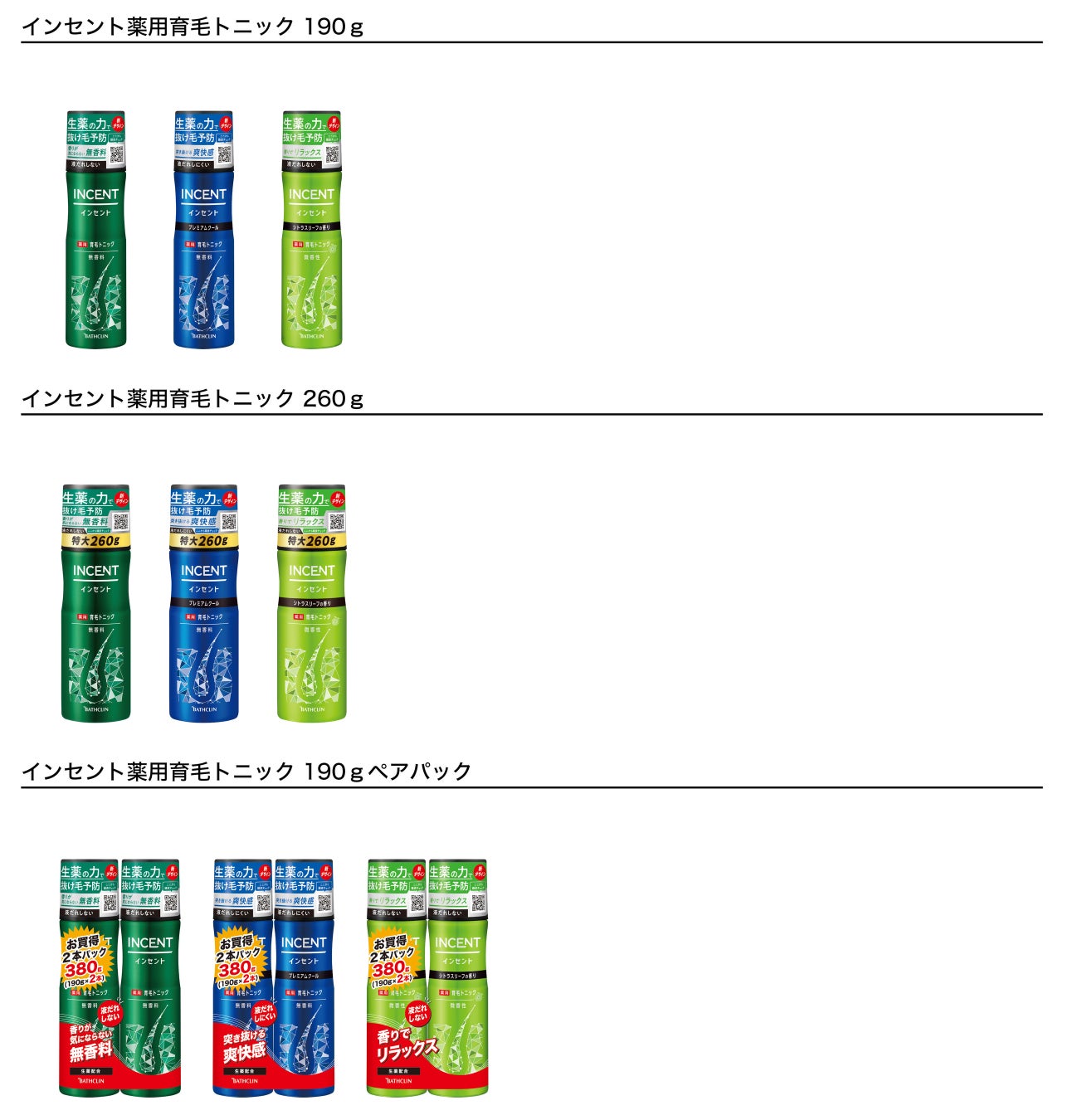 生薬の力で、男性の髪や頭皮の悩みの進行状況に合わせた「予防ケア」を提案し、快適な育毛環境に整え、髪を育てる育毛トニック「インセント薬用育毛トニック」は、1994年の発売以来多くのお客様にご好評いただいております。このたび、容器を持ちやすく進化させ、パッケージデザインを一新し、2月中旬よりリニューアル発売いたします。お好みの使い心地に合わせてアイテムをお選びいただき、ぜひお試しください。