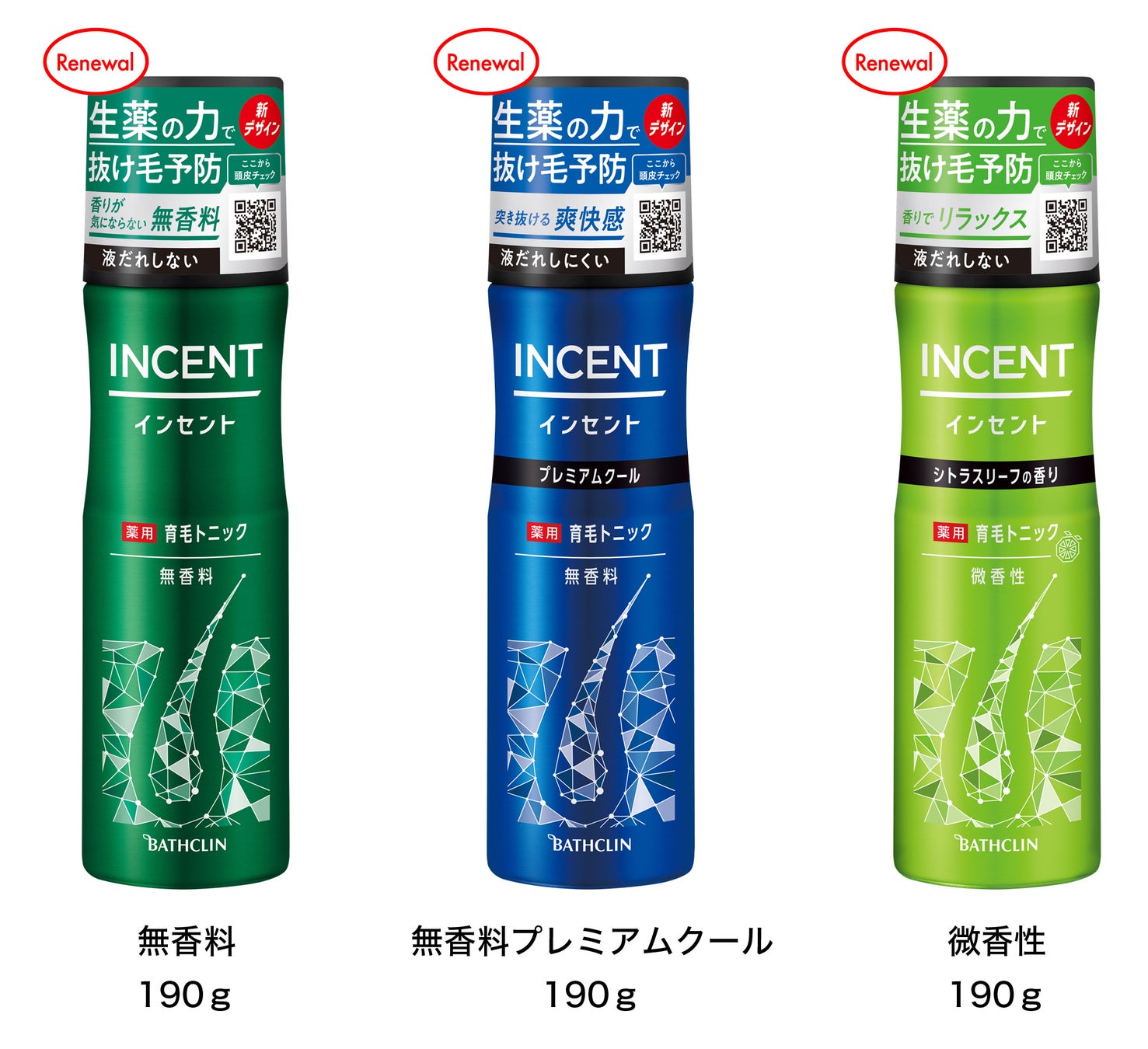 株式会社バスクリン(本社:東京都千代田区 社長:三枚堂正悟)は、生薬の力で抜け毛を予防し、育毛を促す、発売から30年間お客様からご愛顧いただいている「インセント薬用育毛トニック」にて、容器をより持ちやすい形状に進化させ、パッケージデザインを一新して、2月中旬よりリニューアル発売いたします。ご自身の髪や頭皮の悩みに合わせて、お試しください。