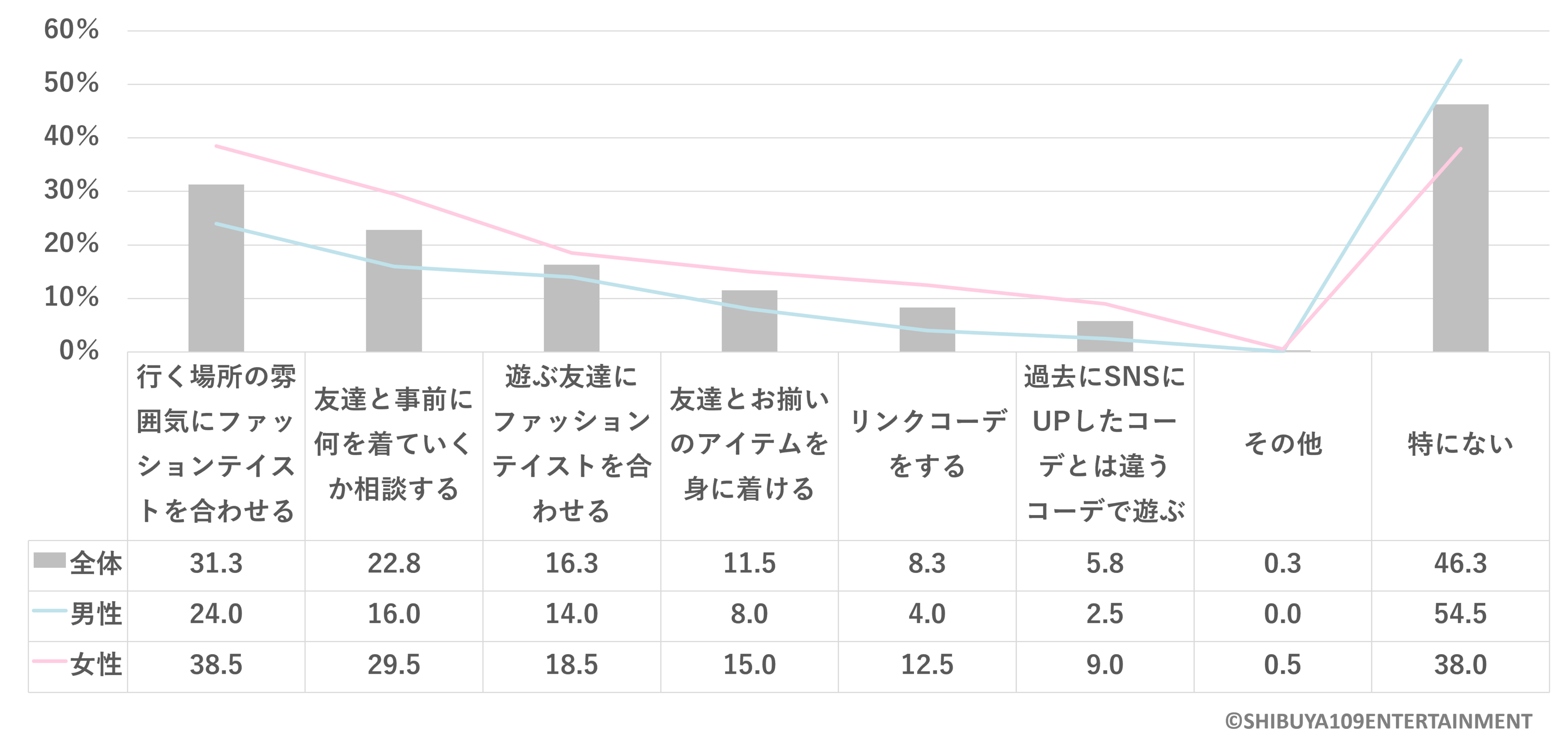 また出かける相手だけでなく、ファッションで気にしている点※図7に関しても「行く場所にファッションのテイストを合わせる(31.3%)」が最多となっています。