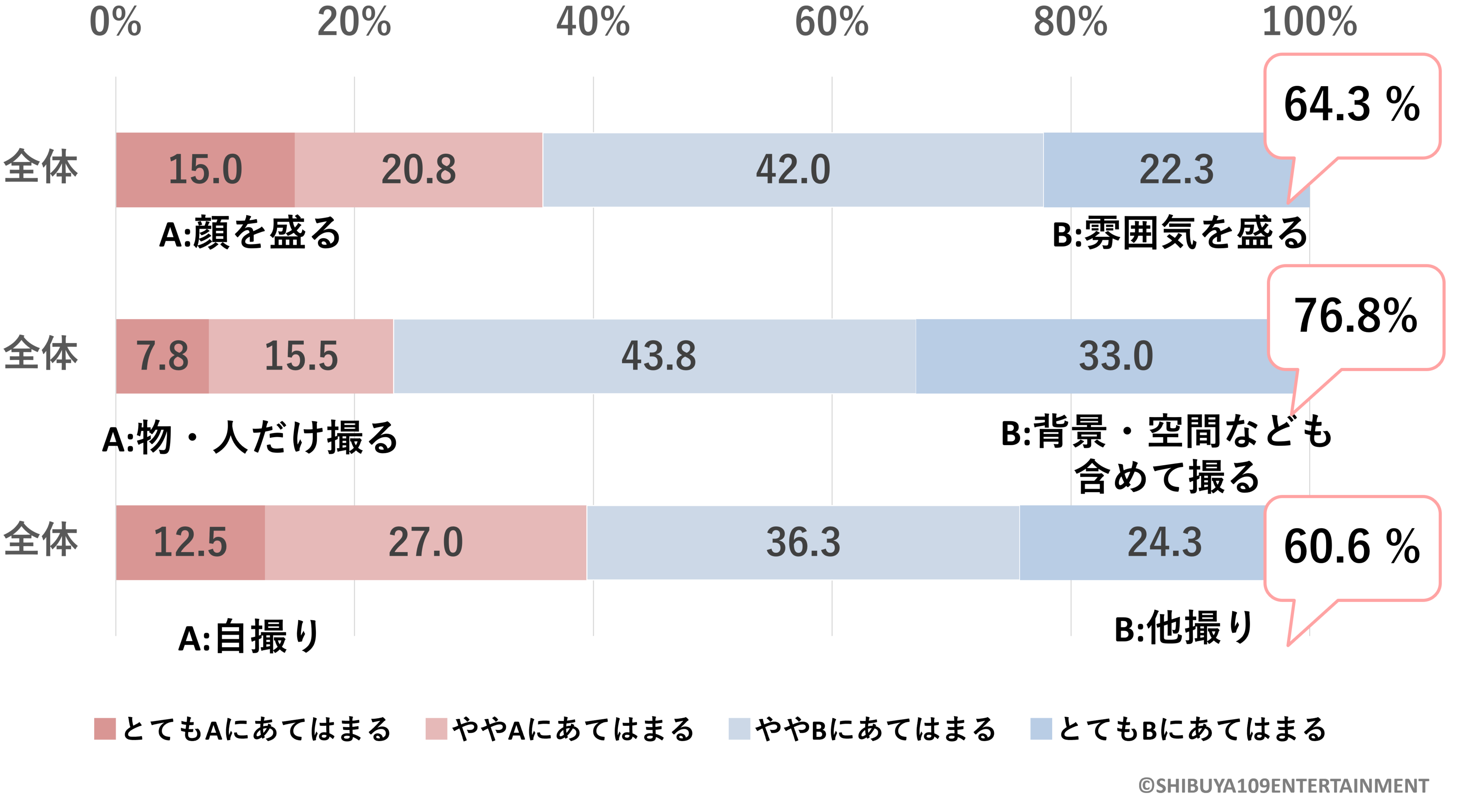 さらに、写真撮影時に大事にすること※図9について聞いてみると、「顔<雰囲気」「物・人だけ<背景・空間なども含める」「自撮り<他撮り」という価値観が見えてきます。