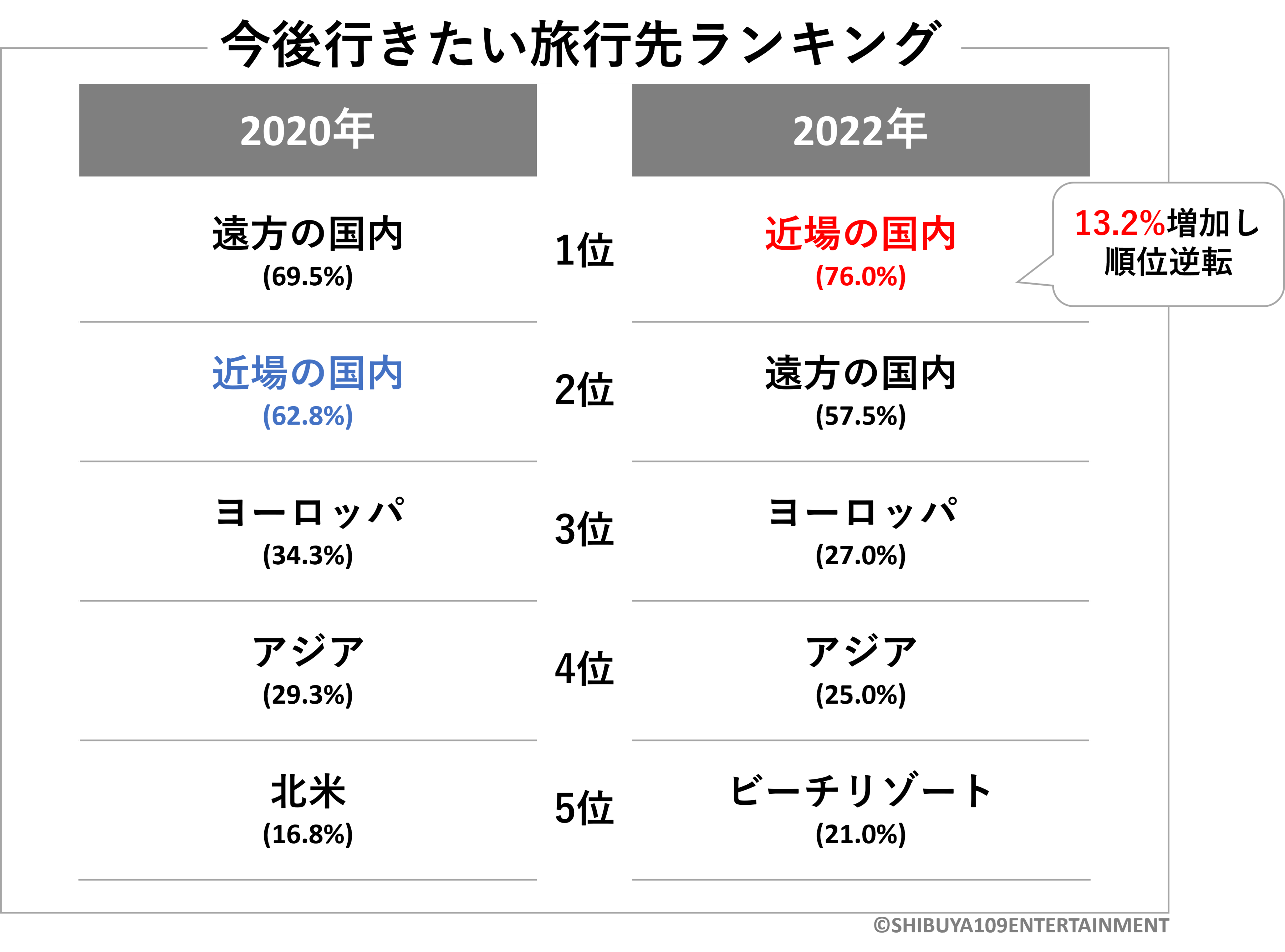 カフェ巡りをはじめとする食べ歩きが、以前よりもお金をかけて楽しまれています。今後行きたい旅行先として「近場の国内」が1位となり、コロナ禍において、近場で非日常を楽しむ旅行スタイルが普及したことで、旅行が日常生活の延長にあるものに変化したことがうかがえます。