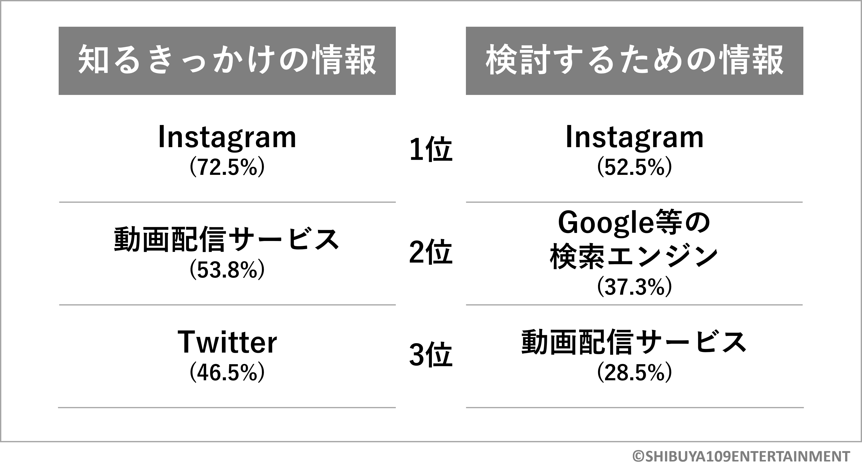 おでかけに関して情報収集するメディアについて、「知るきっかけになる」「検討するときに利用する」メディアに分けて聞いたところ、共に1位は「Instagram」となりました。