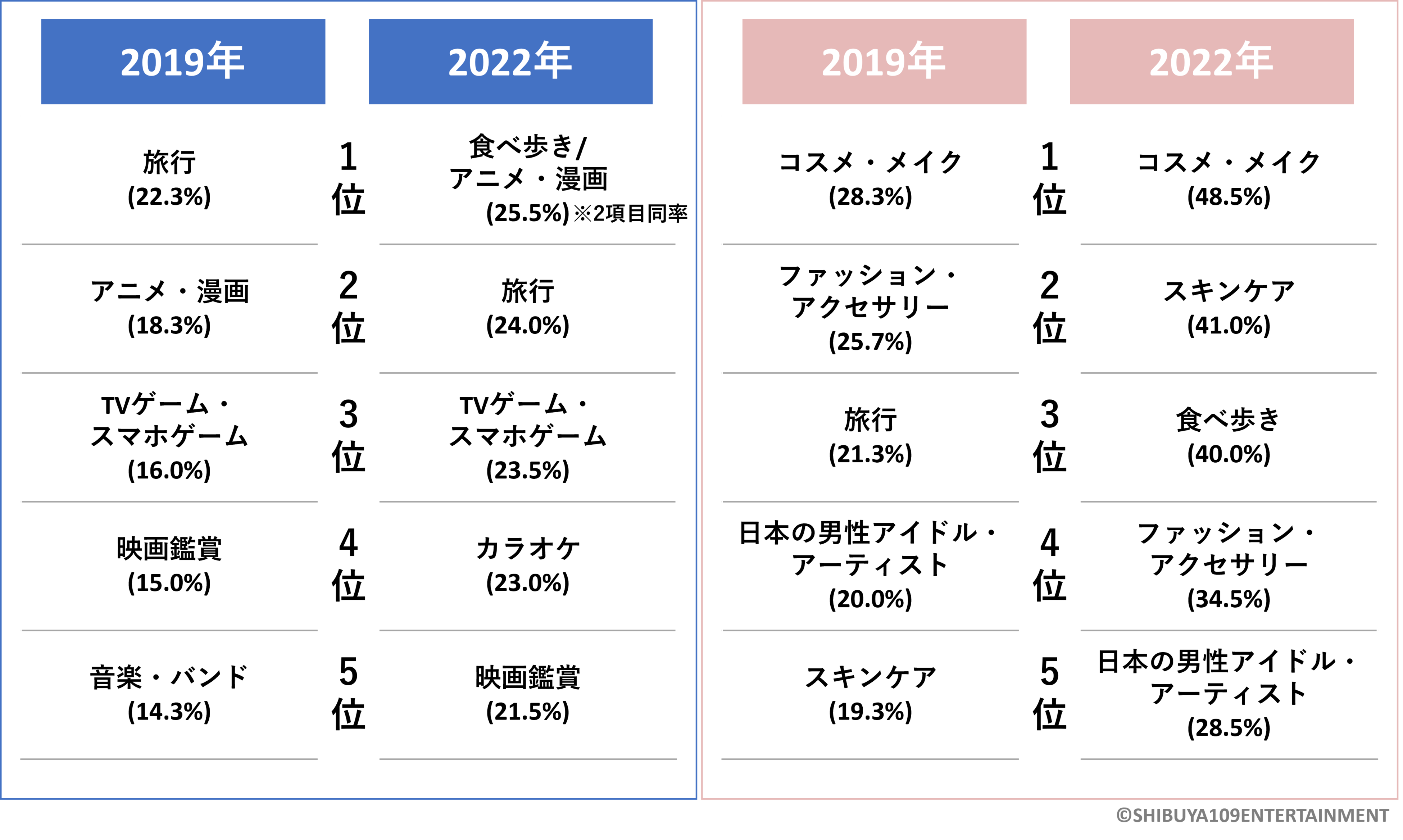 また、男女別の比較結果※図2を見ても、2019年には「旅行」がランクインしていた部分が2022年には「食べ歩き」に男女ともに置き換わっていることもわかります。