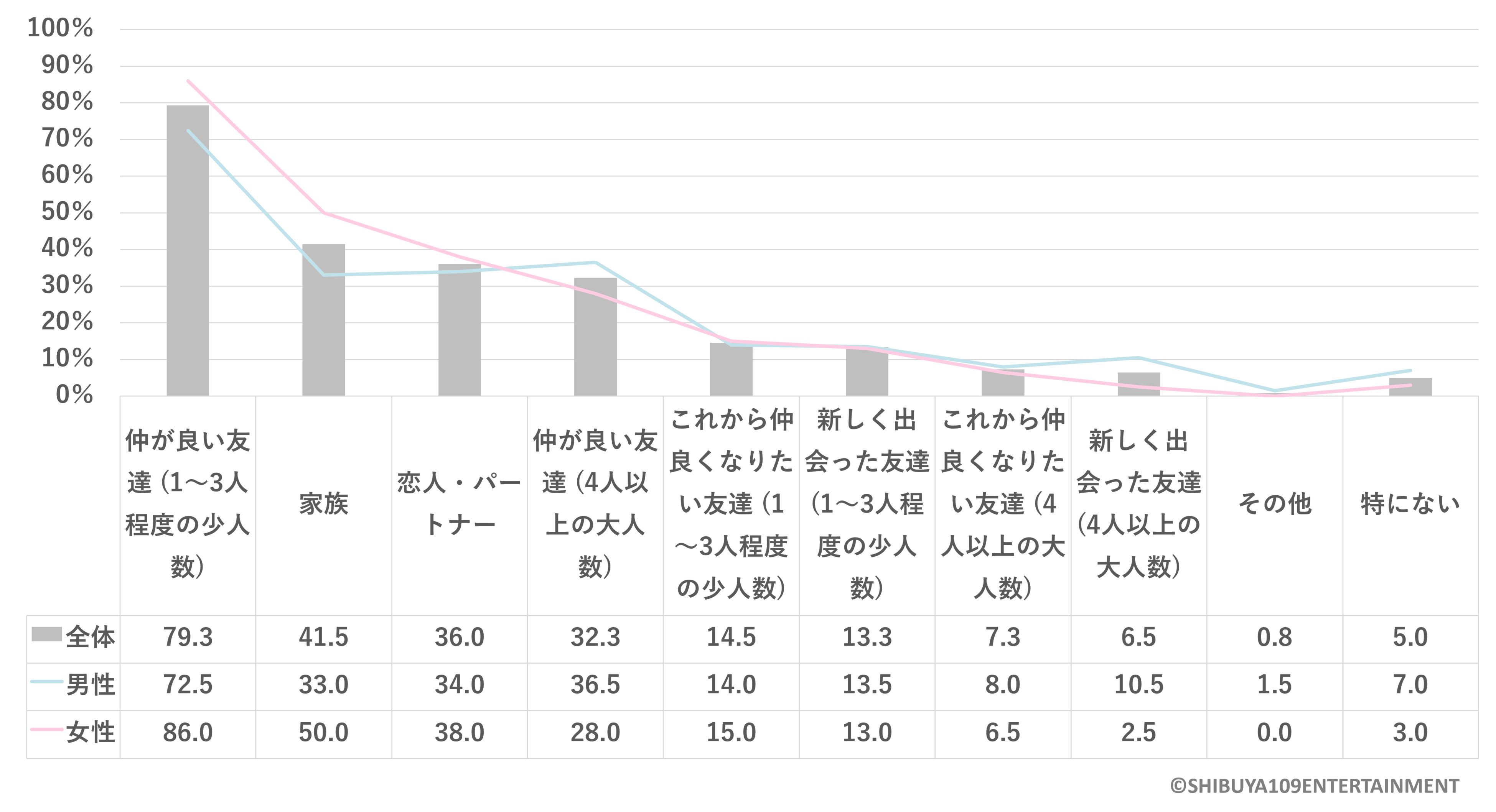 今後一緒におでかけに行きたい相手※図11も「家族(41.5%)」や「恋人・パートナー(36.0%)、「仲が良い友達(4人以上の大人数)(32.3%)」を抜いて「仲が良い友達(1~3人程度の少人数)」が79.3%と圧倒的多数です。