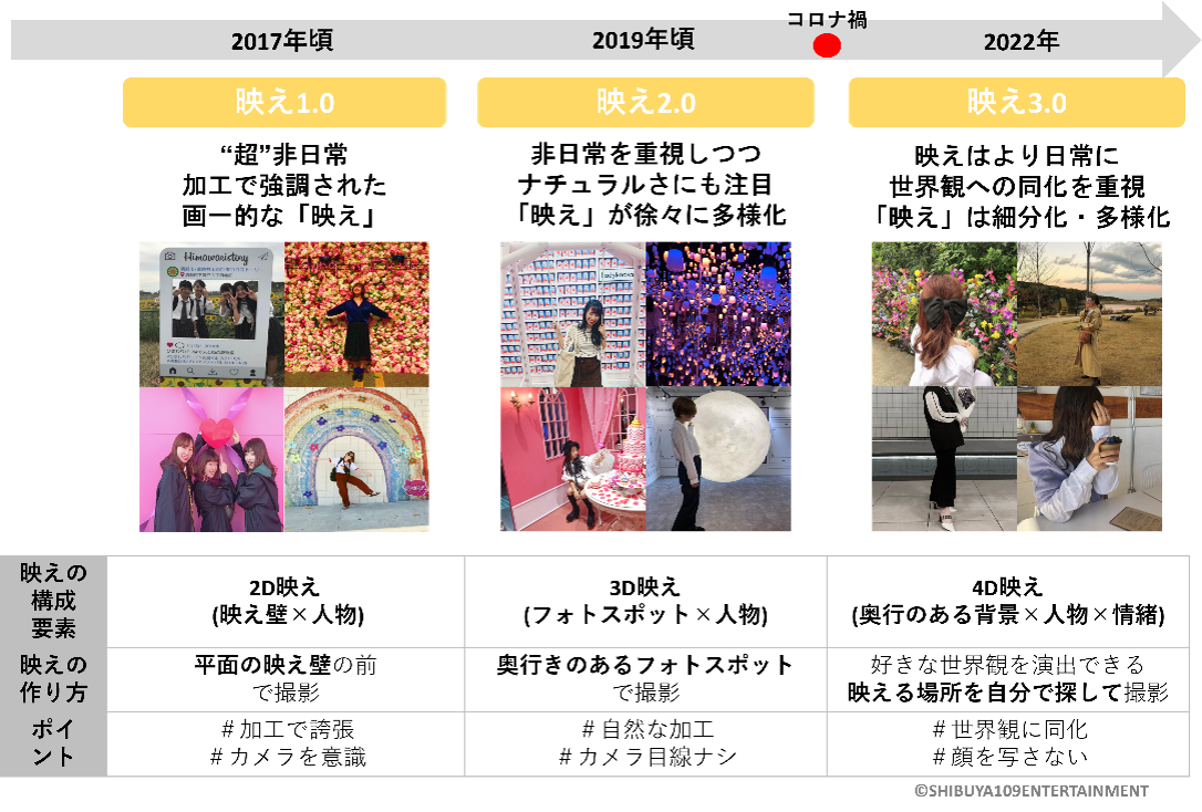 これらの結果を整理すると、Z世代の「映え」はそれぞれが表現したい「世界観」が演出できることが重要であり、「映えの細分化・多様化」が進んでいることがわかります。これについて、SHIBUYA109 lab.では、Instagramが普及した当初に流行った加工で強調され“超”非日常的な写真を撮ることが「映え」の代名詞となり、 画一的であった「映え1.0」、その後「映え」に奥行きが生まれ始め、ナチュラルさも意識され始めた「映え2.0」に続く「映え3.0」と定義しました。
