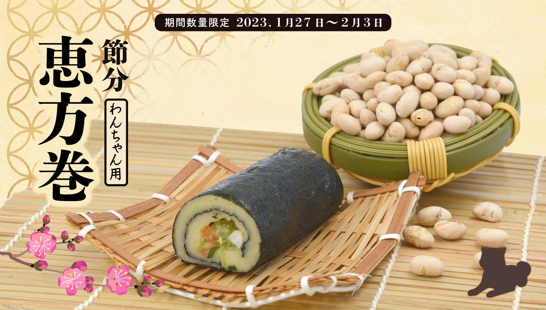 このたび、ペット同飯™️可焼肉店「うしすけ」などを東京・神奈川を中心に展開する株式会社With Pet Family(本社:東京都大田区、代表取締役:𠮷田 達也)は、2023年1月27日から同年2月3日までの期間限定で、わんちゃん用メニュー『節分恵方巻』を、当社直営店舗及び当社ECサイト「うしすけオンラインストア」で数量限定発売いたします。
