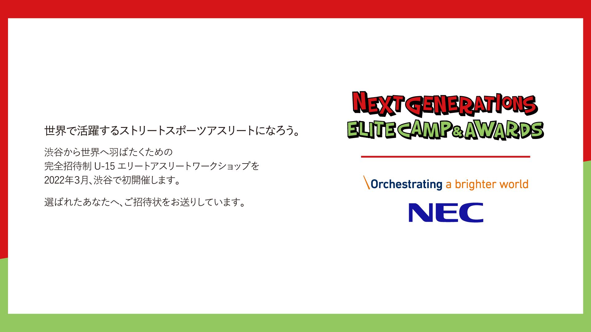 渋谷から世界へ、国内外のストリートスポーツシーンを牽引する若手アスリートを輩出するプラットフォームである「Next Generations」は、この活動によりU-15アスリートたちが「自分の強みを知る・磨く」ためのきっかけを得て、「同世代を知る・つながる」場となることを期待し取り組んでいきます。