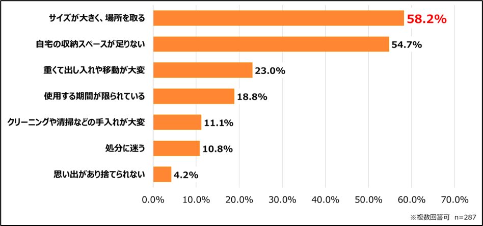 また、「重くて出し入れや移動が大変」(23.0%)や「使用する期間が限られている」(18.8%)といった回答も見られ、物理的な扱いにくさや使用頻度の低さが収納のハードルとなっていることが伺えます。