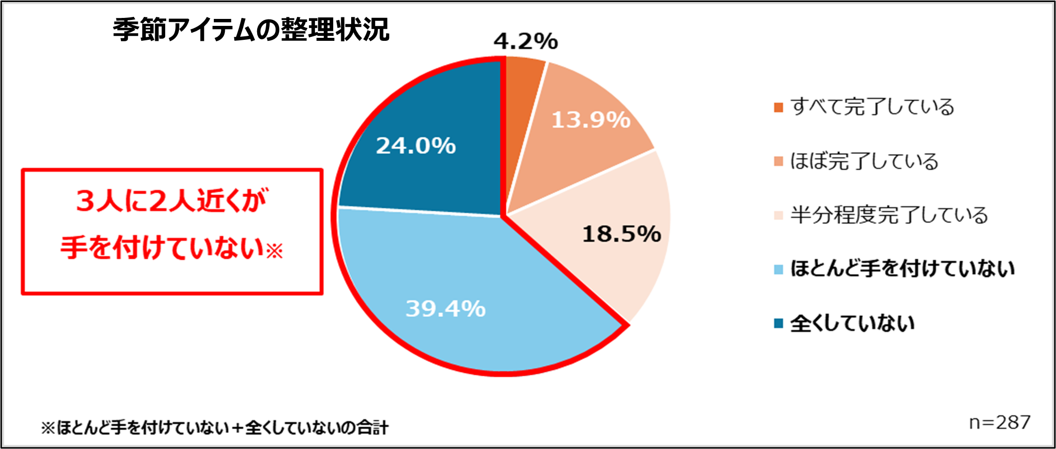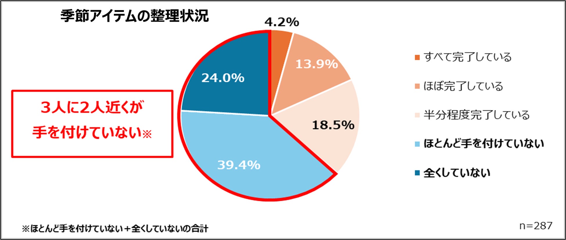 季節アイテムの整理状況について見ると、「ほとんど手を付けていない」が39.4%、「全くしていない」が24.0%となり、これらを合わせると63.4%と、約3人に2人が整理に着手できていない結果となりました。