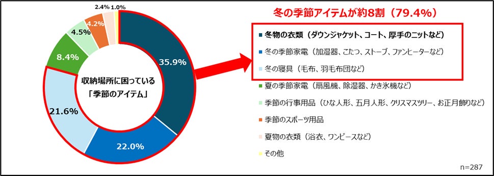 ◆収納場所に困るのは「冬の季節アイテム」が約8割、約3人に2人が季節アイテムの整理に着手できていない。