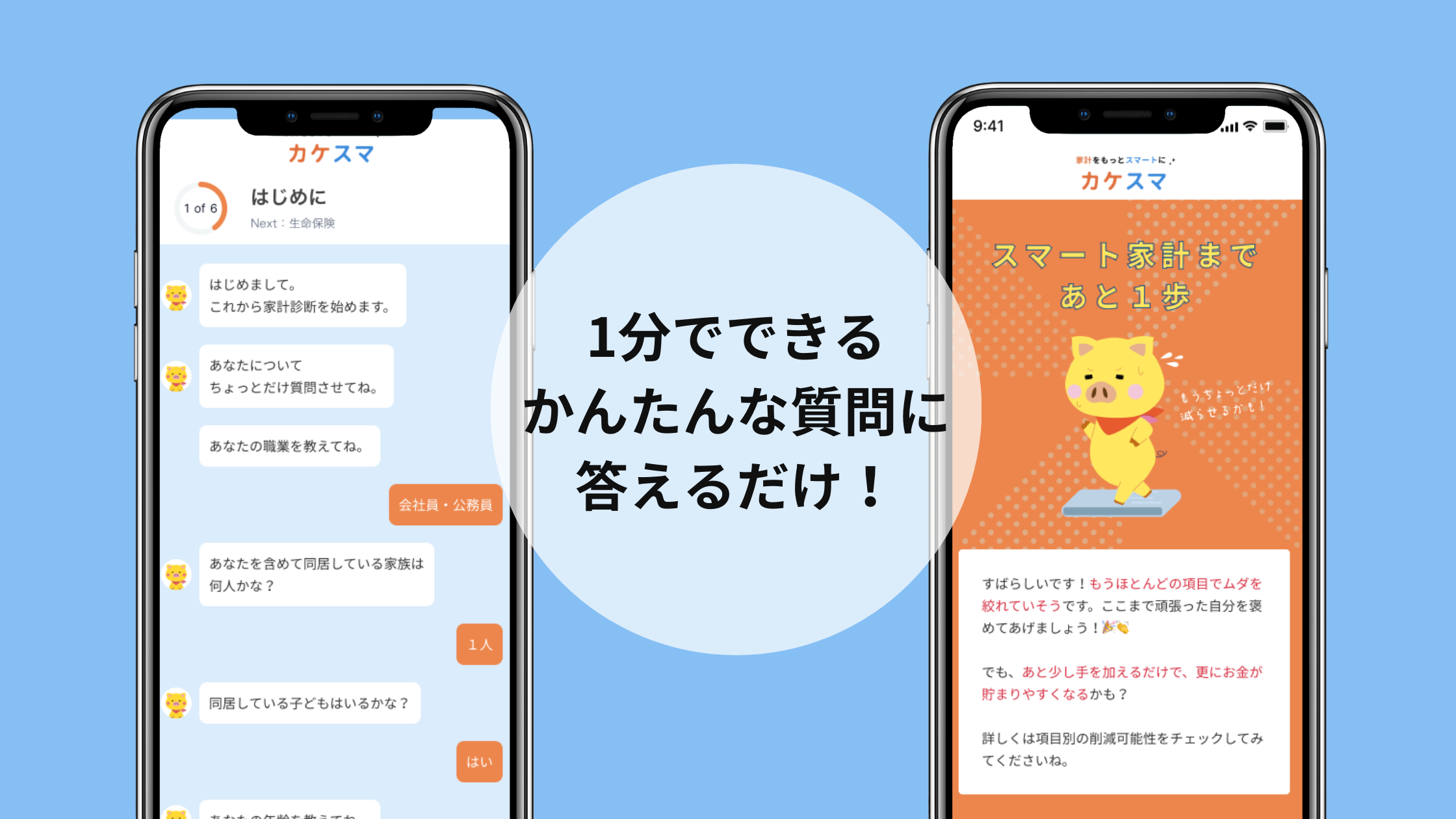 本サービスは、Webサイト「カケスマ」内でご利用できます。チャット形式で質問に答えるだけで家計の見直しポイントがわかる無料の診断サービスです。所要時間1分程度でかんたんな診断設問に回答することで、5項目(生命保険、スマホ通信費、資産運用、住宅ローン、損害保険)の家計見直しの可能性をチェックすることができます。また、各項目の家計の無駄・改善に関するワンポイントアドバイスを確認することができます。