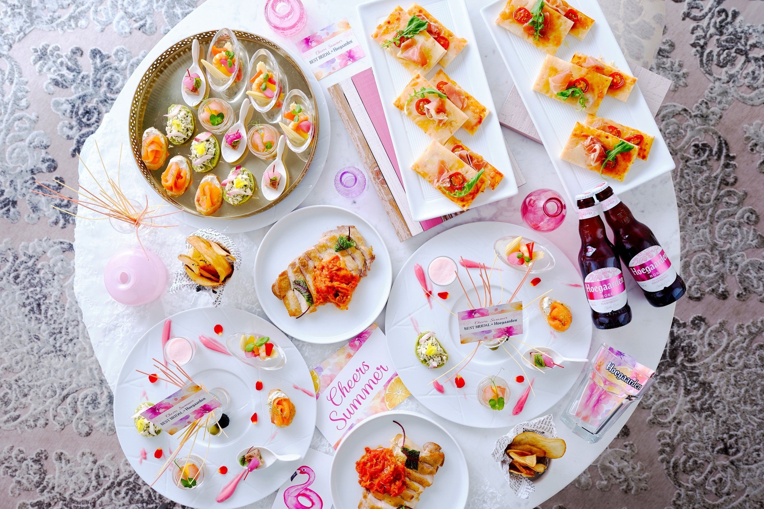 今回は香り華やぐフルーティーな味わいが特徴のホワイトビールにぴったりな「夏のごちそう Juicy Meat」と、ラズベリー香る華やかなヒューガルデン ロゼとのペアリングを楽しむことができる「ご褒美プレート Beer Jewel」の2つのプランをご用意しています。どちらもベストブライダルが誇るシェフたちがヒューガルデンの魅力を最大限に生かした、誰もが楽しめる深みのあるペアリングを考案。特別な日にも、日常のご褒美にもなるような“贅沢でやさしい”世界観を食事とヒューガルデンで表現した特別メニューです。「夏のごちそう Juicy Meat」には、パクチーが香る“コリアンダーチキンオレンジ風味”や、ホワイトビールと相性抜群のビーフカレーパエリア、ベルギーをイメージしたワッフルポテトなど、味わい豊かなメニューが揃います。「ご褒美プレート Beer Jewel」では、ヒューガルデンロゼの色味に合わせた桃の冷製スープや、バジル香るタルティーヌなど、見た目も華やかな一皿を提供します。
