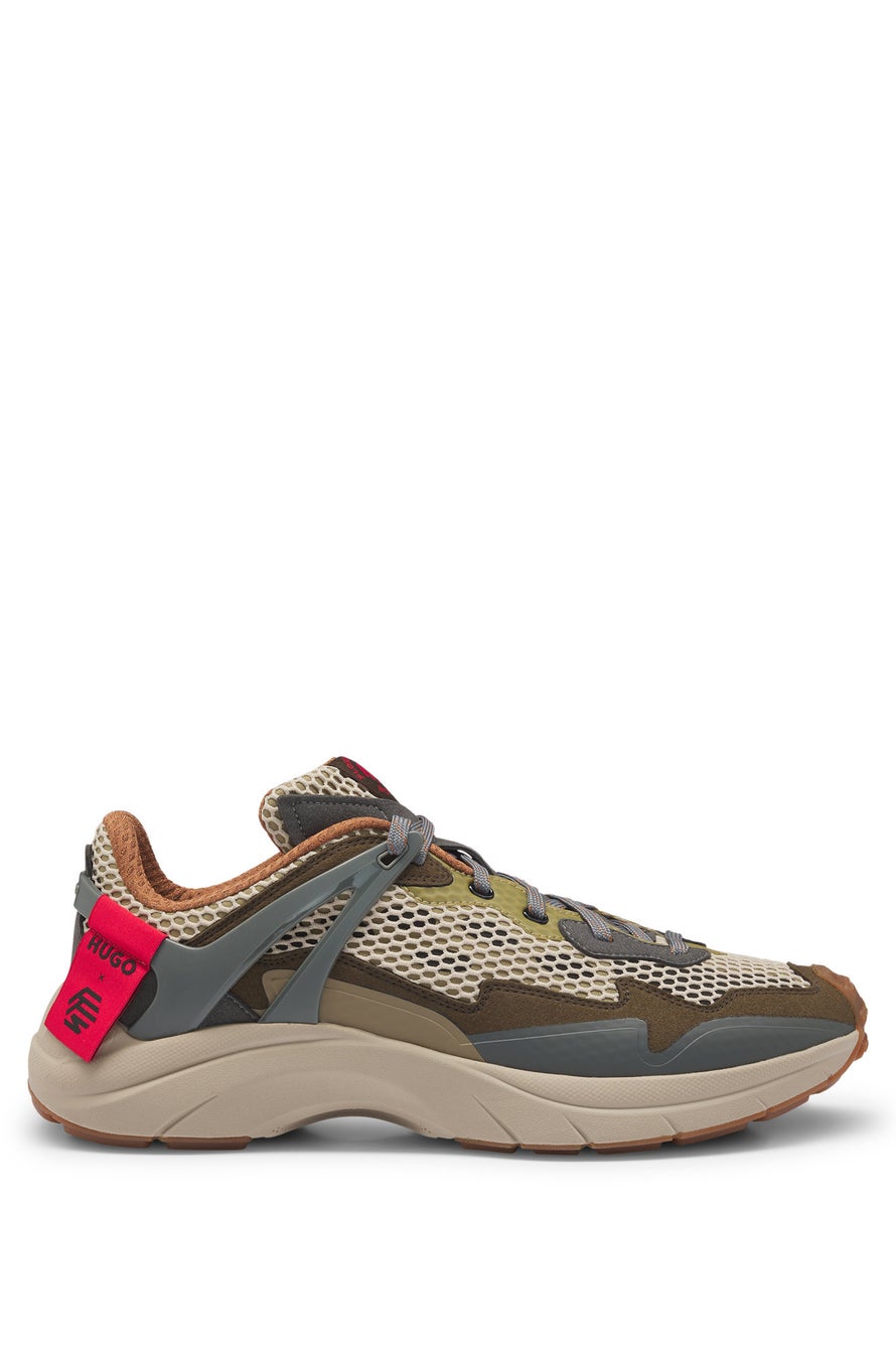 このコラボレーションから生まれた新作は、アート、アティチュード、革新性を融合させ、個性を持って際立ちたい人々に向けてデザインされています。HUGOの大胆なデザインDNAとFlowers for Societyの革新的な精神が交わる「HUGO x FFS GO-2」スニーカーは、ストリートスタイルの魅力に冒険心を加えた一足です。デザインはオープンメッシュパネルと重なり合うレイヤーで構成され、ベージュを基調にグレー、グリーン、ブラウンといったアースカラーを採用し、脱構築の美学が感じられます。シルエットは洗練されたランニングスタイルをベースにしつつ、ハイキングを意識したトレッドソールやHUGOの赤いラベルの大胆な再解釈など、破壊的なアクセントが施されています。これは創造性が無限に広がる新たな可能性の庭園へと自信をもって踏み出すためのシューズであり、自分のルールで生きる自己表現豊かな人々に最適です。HUGOのブランドプラットフォームである“HUGO Your Way“にも完全にマッチしています。