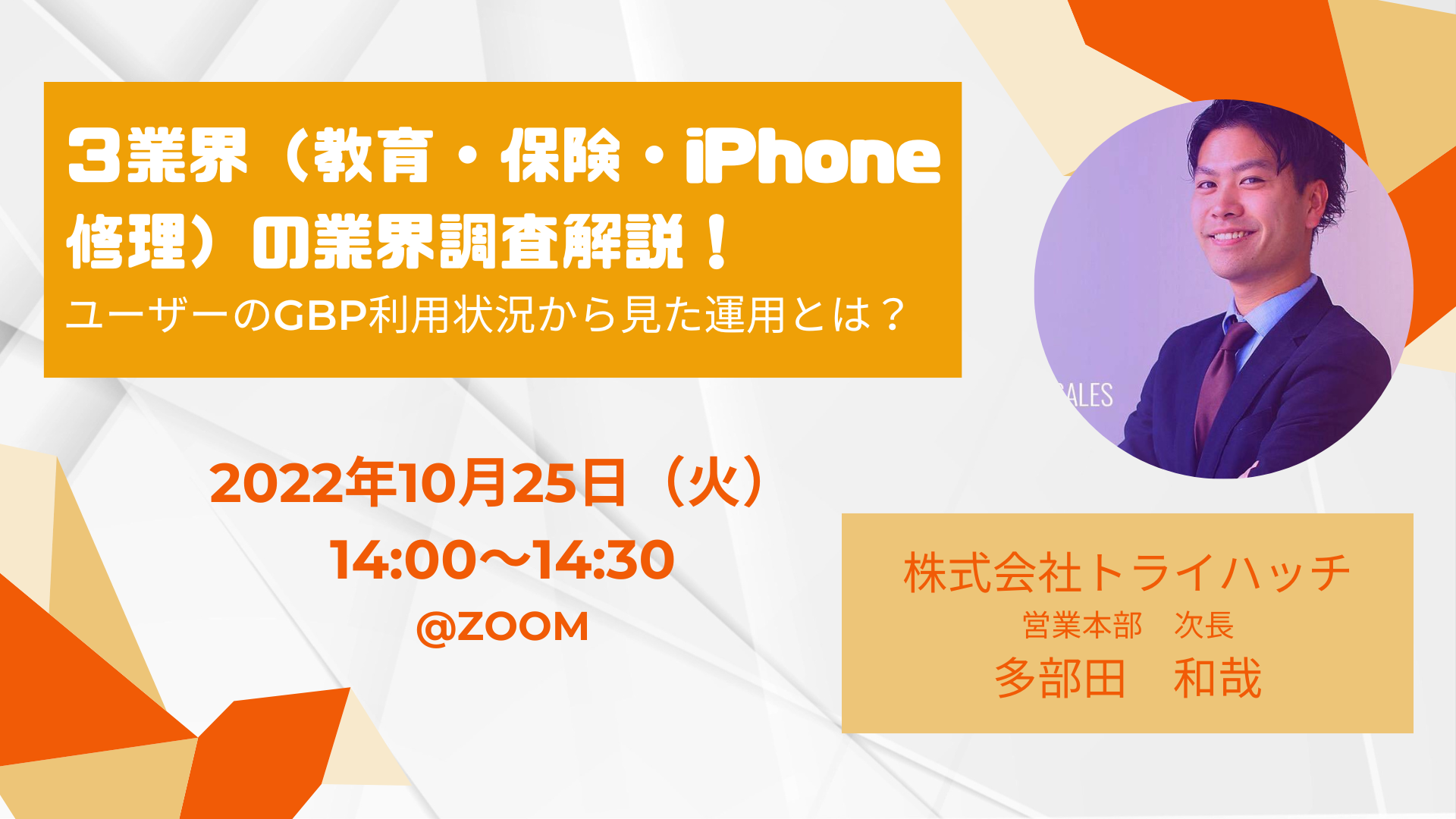 【2022年10月25日(火)14:00~14:30】教育・保険代理店・iPhone修理業界の利用調査結果を解説!ユーザー行動から導き出すGoogleビジネスプロフィール運用の最適解とは?