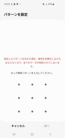 【パターン認証】:9つの点を結ぶパターンでロックを解除する方法です。指先の動きなどでパターンが予測されやすいデメリットがあります。セキュリティ性は中くらいです。