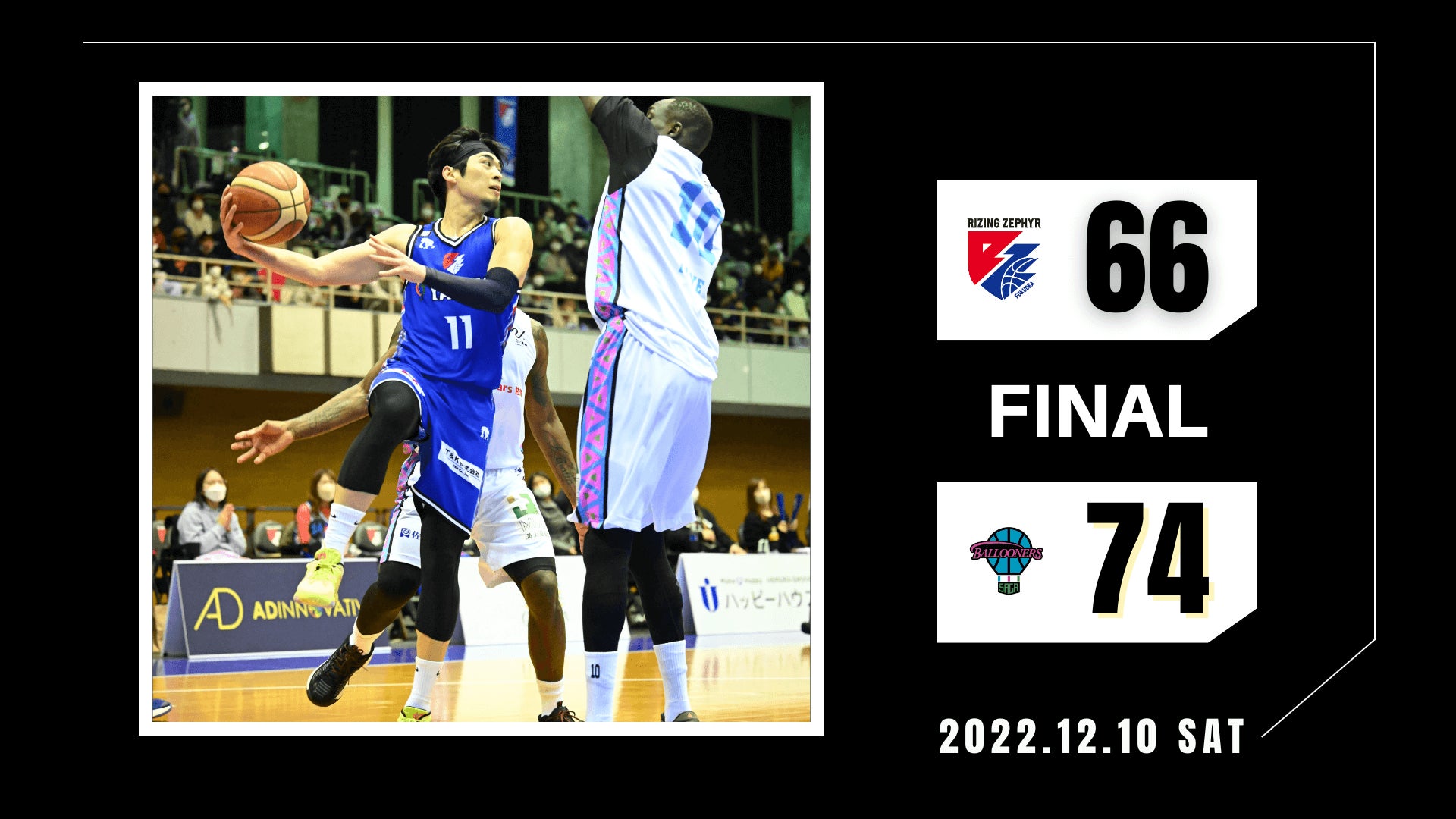 2022年12月10日(土)に開催されましたBリーグ第11節【ライジングゼファーフクオカvs.佐賀バルーナーズ】において“福岡66​-74佐賀”の結果となりましたことお知らせいたします。