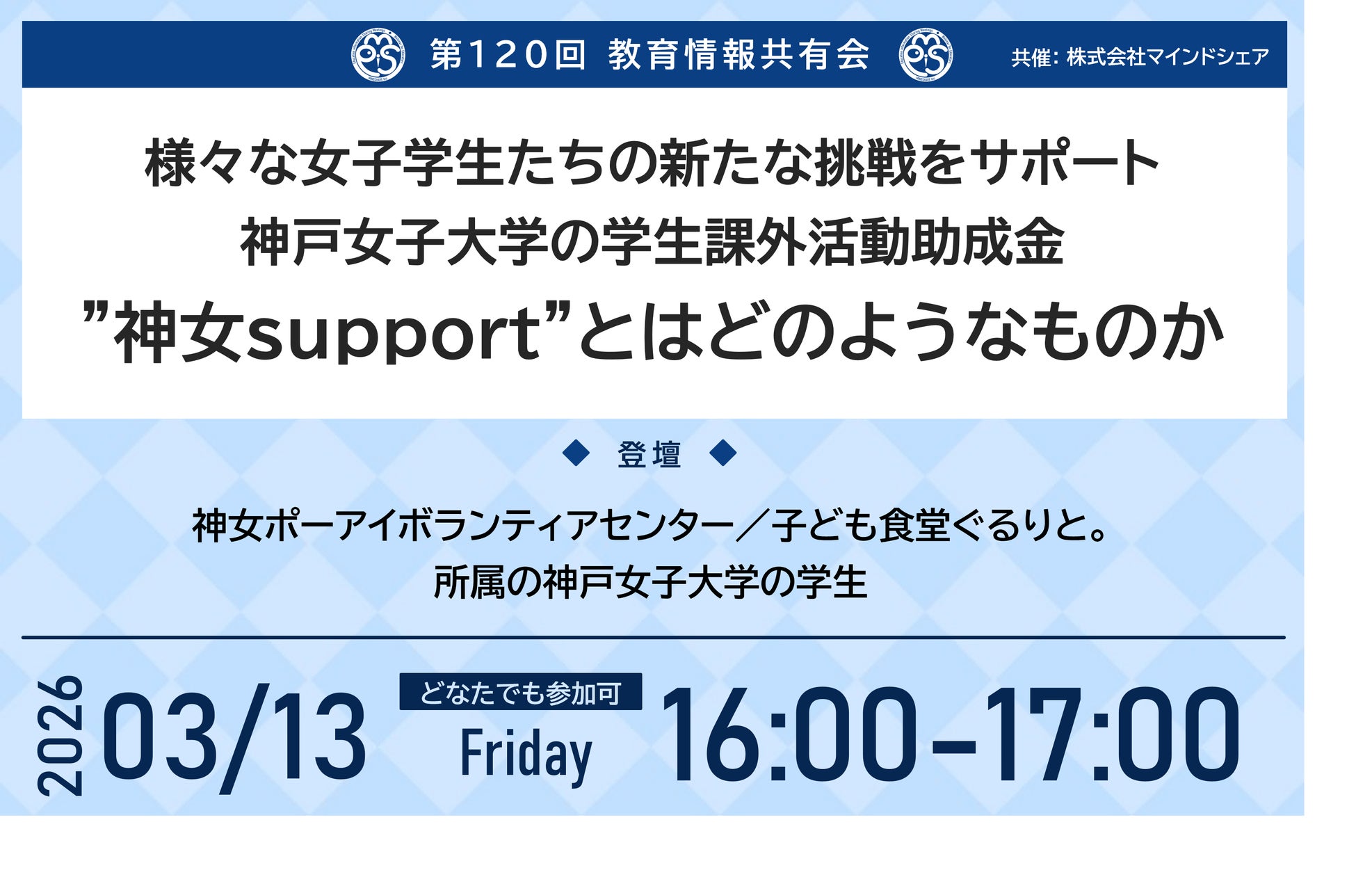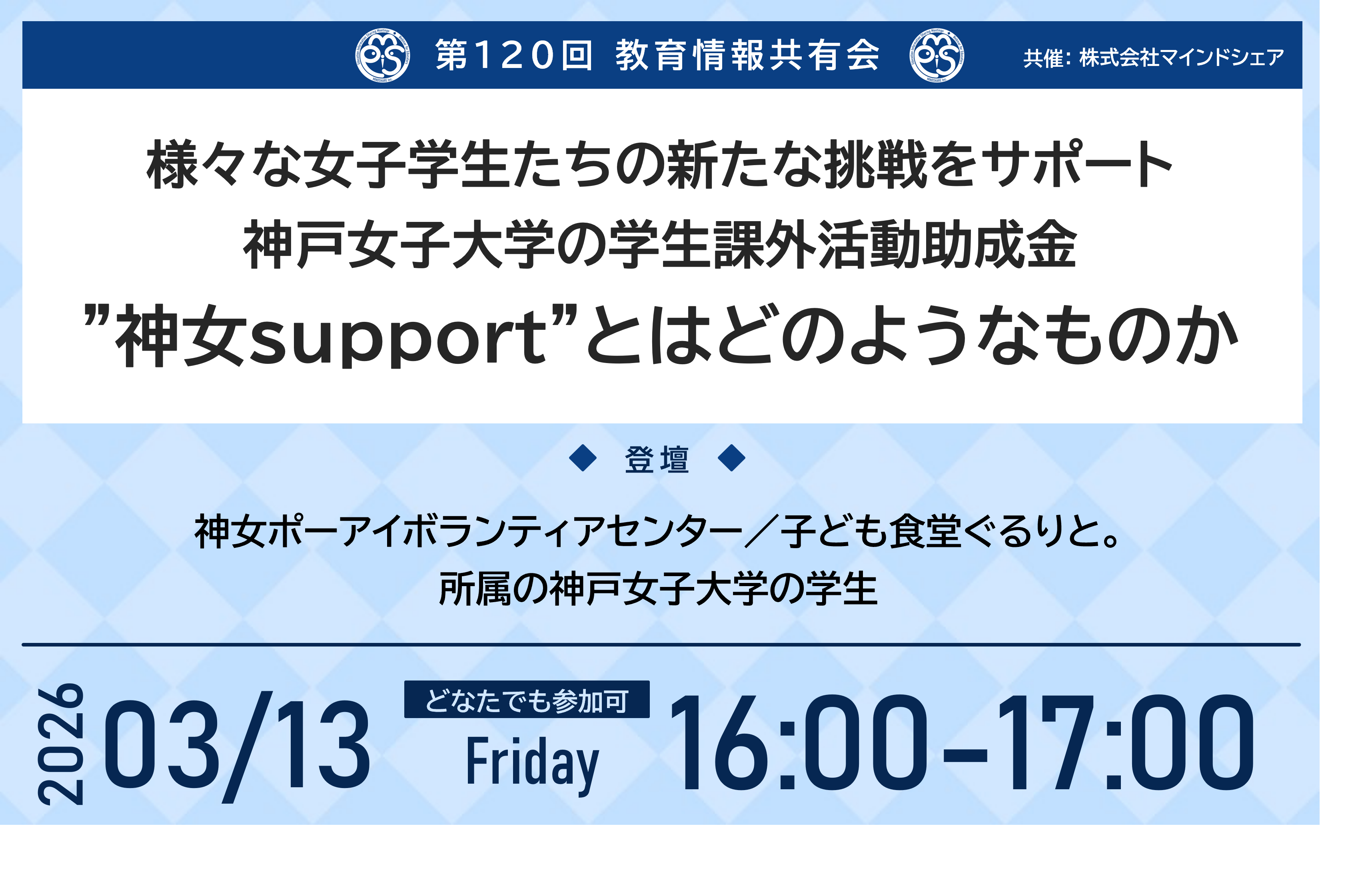 教育業界の取り組みを共有!約14,000人が参加!第120回教育情報共有会「様々な女子学生たちの新たな挑戦をサポート 神戸女子大学の学生課外活動助成金”神女support”とはどのようなものか」