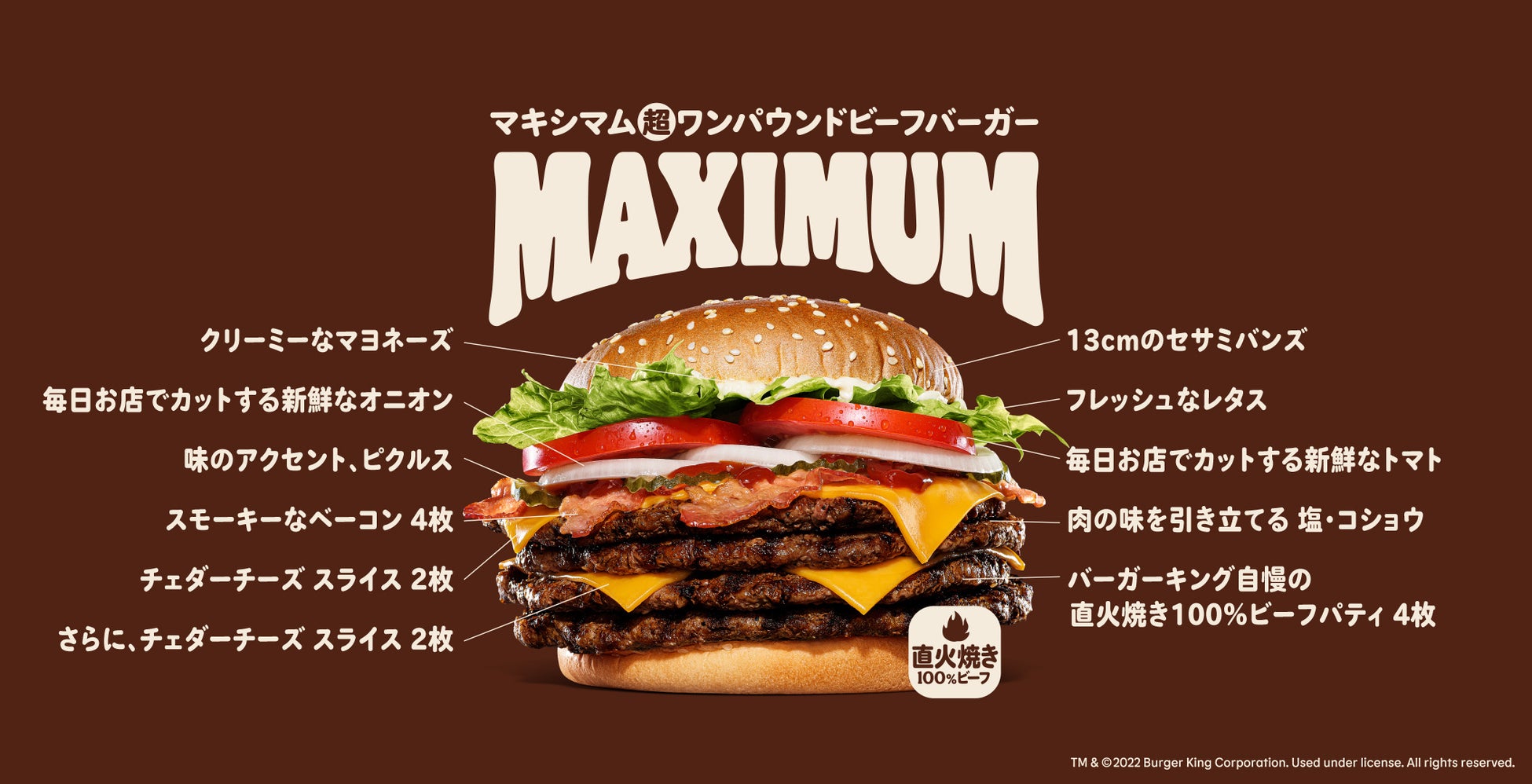バーガーキング® から総重量608g、総カロリー1,633kcalの巨大本格バーガー登場!直火焼きビーフ4枚にバンズと野菜のバランスがパーフェクトな『マキシマム超ワンパウンドビーフバーガー』限定発売!