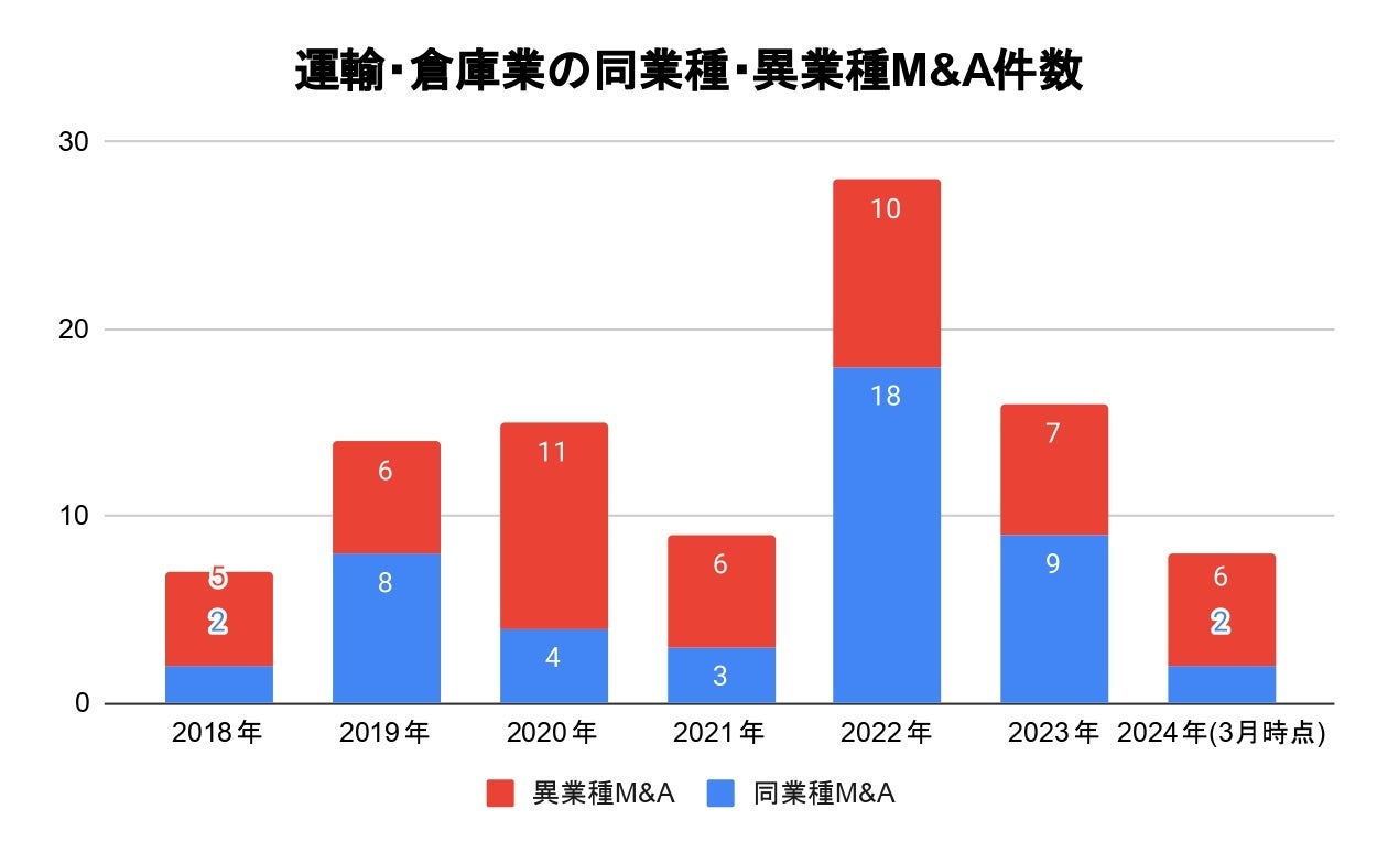 運輸業界における2018年1月から2024年3月までのM&A成約件数は97件、期間中で最多となったのは2022年の28件(同業種M&A18件、異業種M&A10件)です。