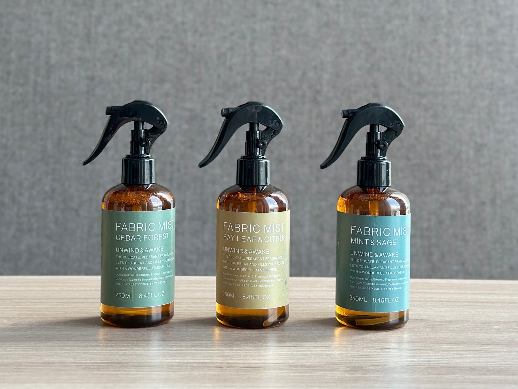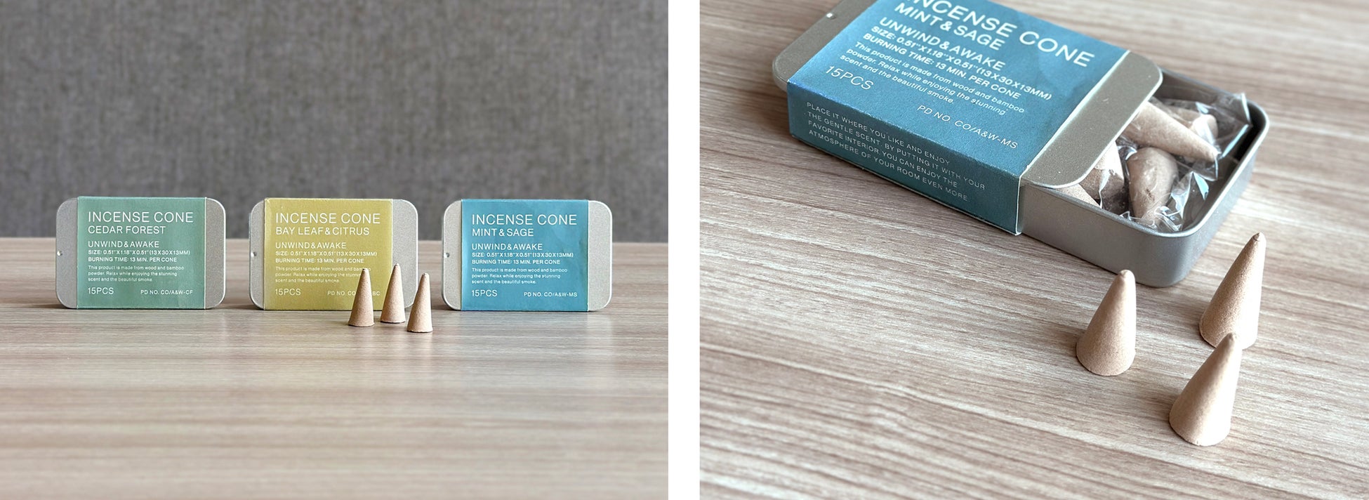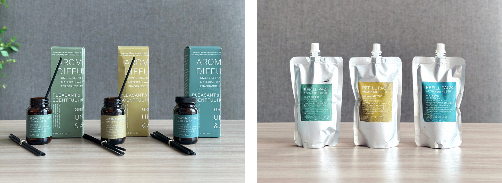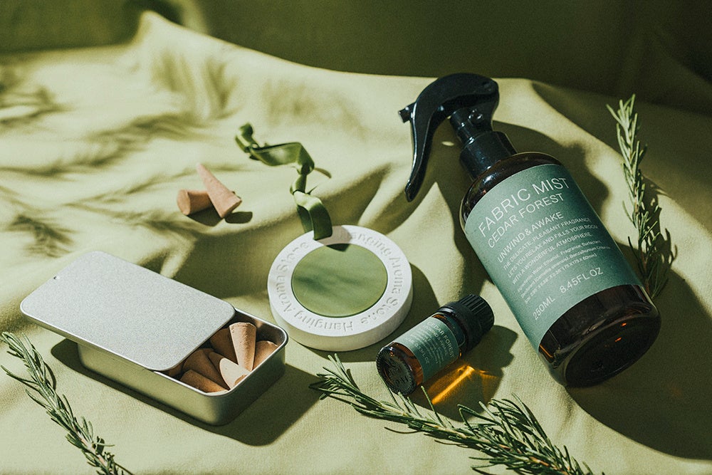 新しいフレグランスシリーズは、シダーフォレスト、ベイリーフ&シトラス、ミント&セージのすっきりとした爽やかな印象の3種の香りで展開します。それぞれアロマディフューザー、アロマディフューザーリフィル、インセンスコーン、ファブリックミスト、アロマストーンの5種類、全15種をご用意しています。