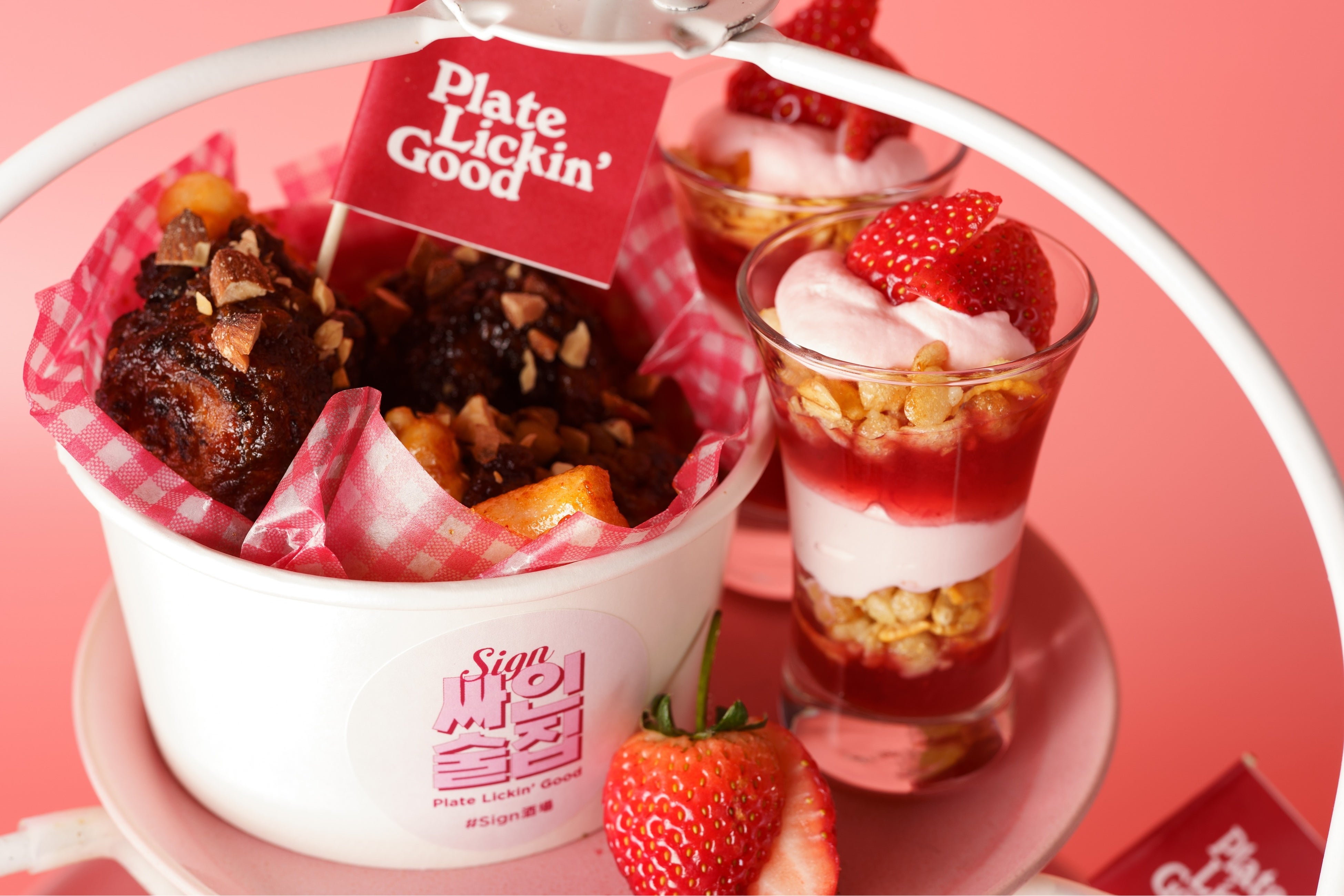 上段には、さっくりと軽やかな食感の定番サイドメニューであるモチコチキンに韓国料理のエッセンスをプラスし、特製旨辛ヤンニョムソースを纏った「ヤンニョムモチコチキン」と甘酸っぱさがクセになる「苺のパフェ」をご用意いたしました。