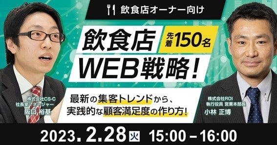 国内最大級の顧客満足度向上プラットフォーム「ファンくる」を運営する株式会ROI(本社:東京都千代田区、代表取締役社長:山口敬人)は株式会社CS-C(本社:東京都港区、代表取締役:椙原 健)と共催で、「飲食店WEB戦略!最新の集客トレンドと実践的な顧客満足度の作り方を大公開!」 (定員150名/無料)を2月28日(火)に開催いたします。(https://biz.fancrew.jp/seminar20230228_contact?=pr1)