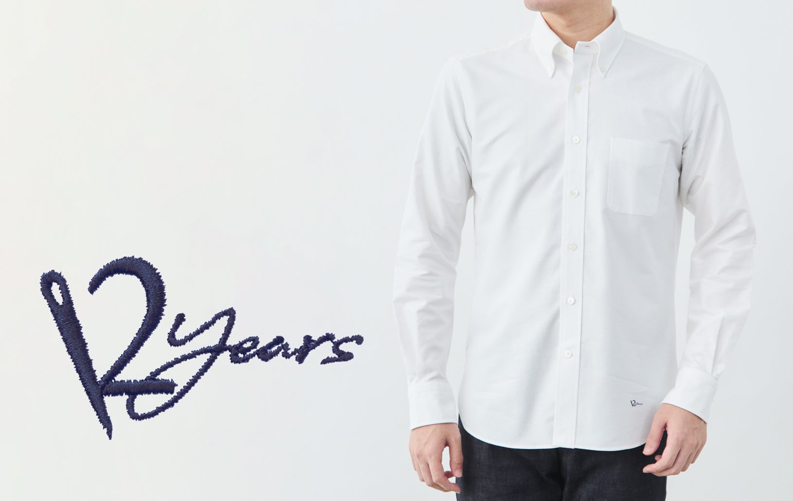 ファクトリエ12周年記念にちなみ、「12 Years」のネイビー刺繍をさりげなくフロント左裾にあしらった、限定アイテム「セルビッチ オックスフォードシャツ」が登場。